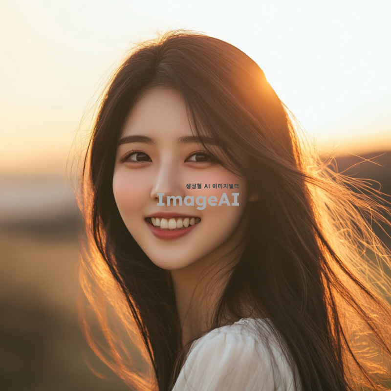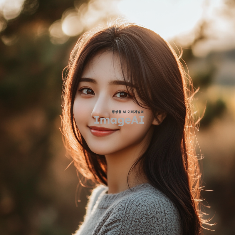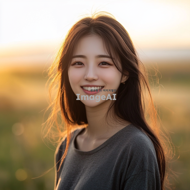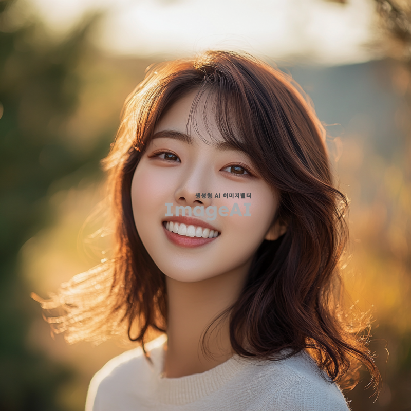젊고 예쁘며 청순한 한국 여성의 초상화, 자연스러운 조명 아래에서 미소 짓고 있는 모습, 부드러운 피부와 맑은 눈, 간결한 패션 스타일, 배경은 흐릿한 자연 풍경, 따뜻한 색조로 분위기 강조, 감성적인 포즈와 표정.