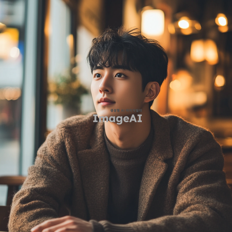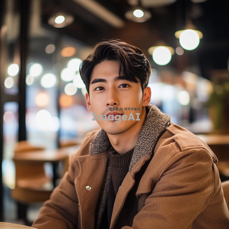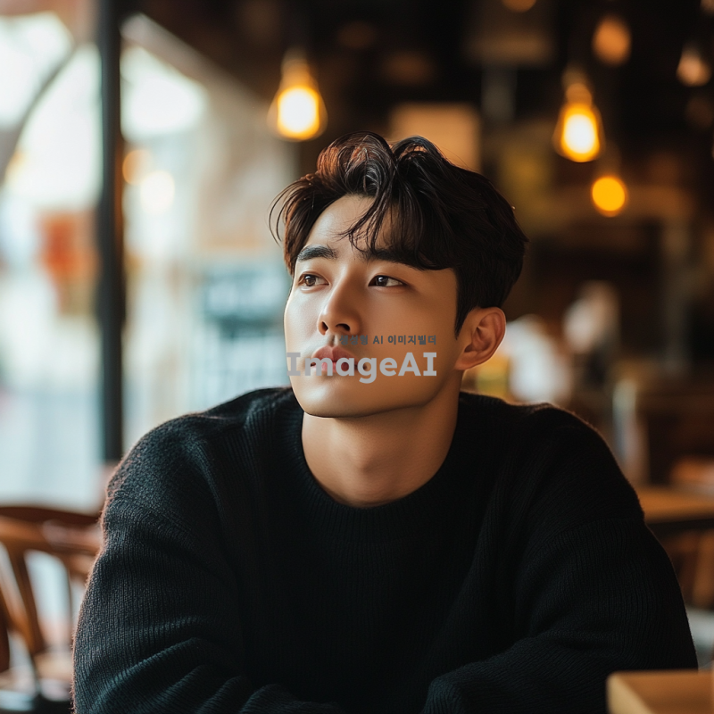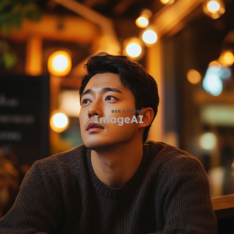 잘생긴 한국 남성이 결혼에 대한 생각이 없음을 표현하는 이미지. 그는 편안한 옷을 입고, 여유로운 표정으로 카페에 앉아있으며, 주변 사람들과의 대화나 소통에 관심이 없는 모습. 배경은 아늑한 카페 분위기로, 따뜻한 조명이 비추고 있다. 남성의 눈빛은 자신감 넘치고 독립적인 느낌을 주며, 결혼에 대한 고정관념과는 거리가 먼 자유로운 삶을 즐기는 모습.