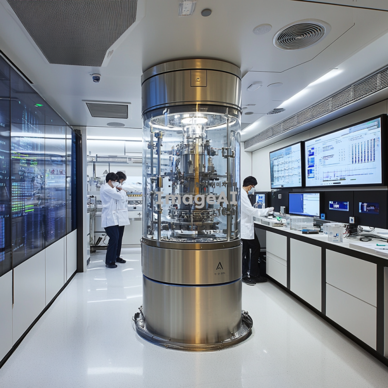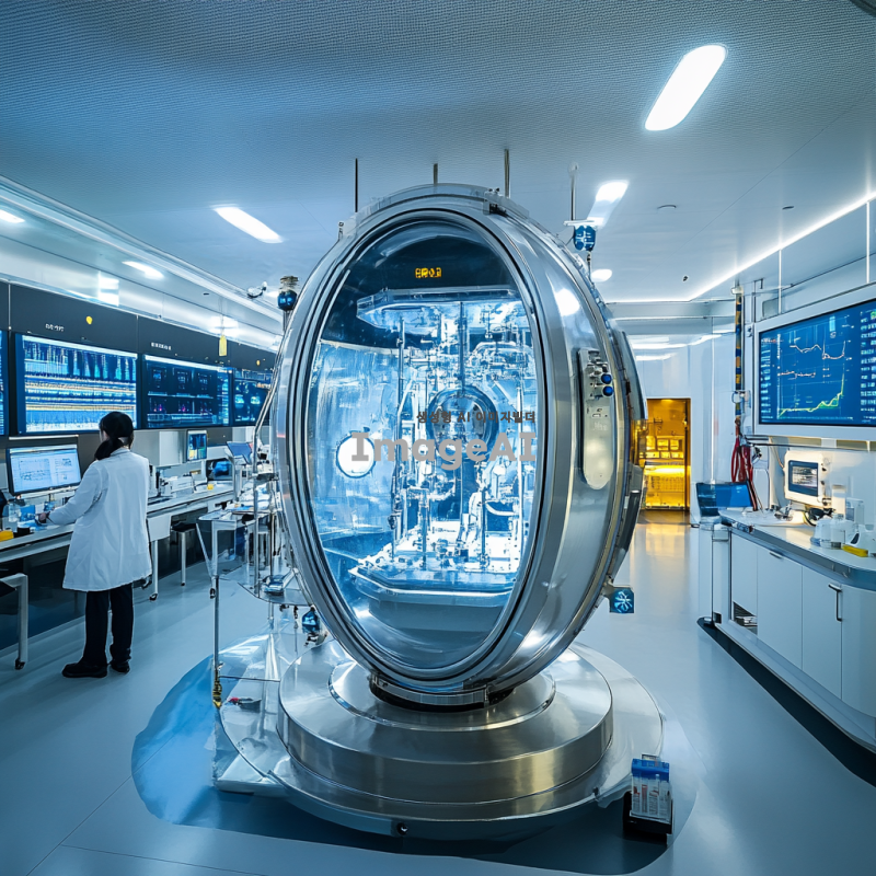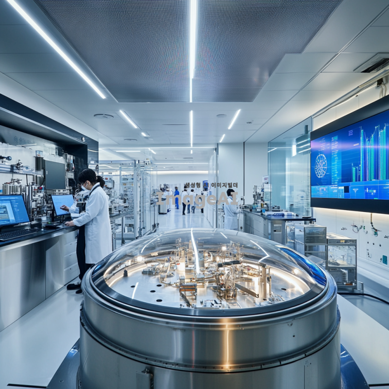 한국의 현대적인 실험실 환경에서 진공 챔버가 중심에 위치한 모습. 진공 챔버는 금속으로 제작되어 있으며, 내부에는 다양한 실험 장비와 샘플들이 배치되어 있다. 주변에는 과학자들이 연구를 진행하고 있는 모습이 보이며, 실험실의 벽에는 다양한 그래프와 데이터가 표시된 화면이 있다. 조명은 밝고 깨끗하며, 전체적인 분위기는 전문적이고 혁신적인 느낌을 준다.