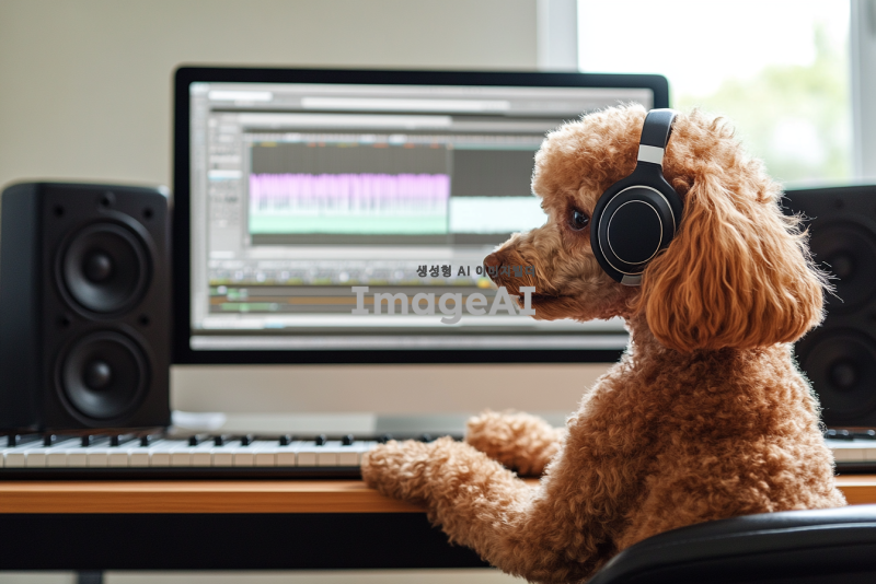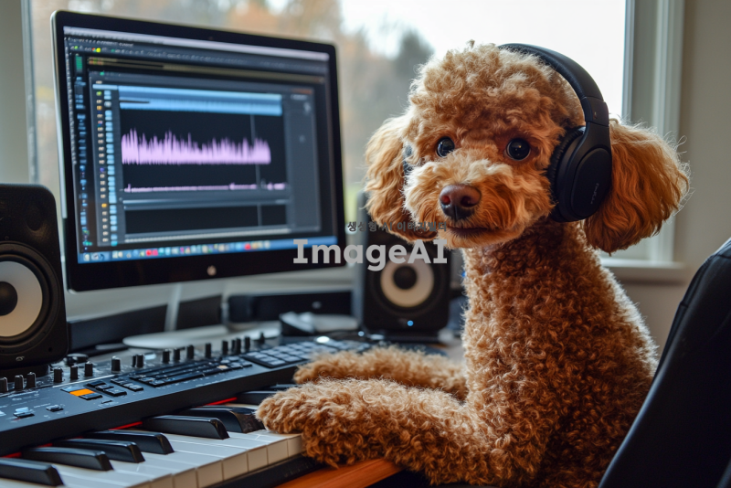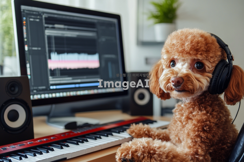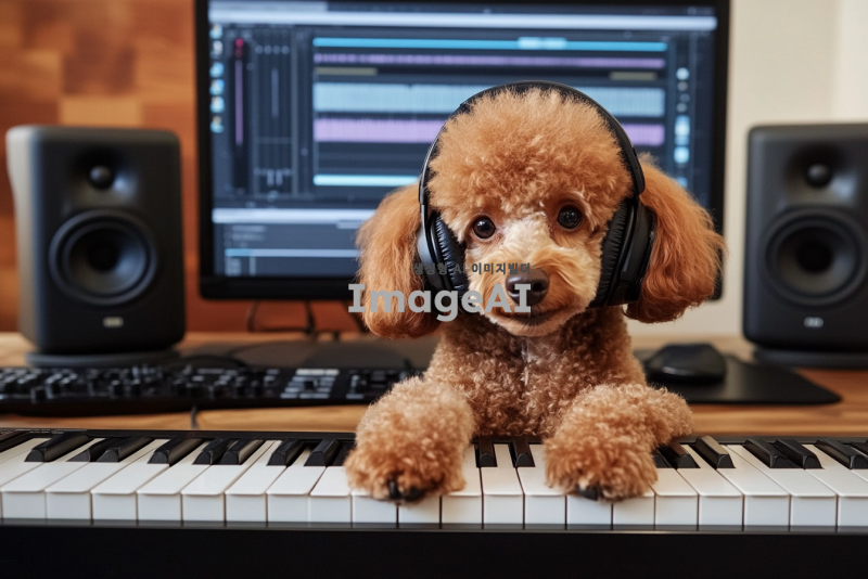 귀여운 갈색 푸들이 헤드폰을 끼고 책상에 앉아 있으며, 피아노 위에 푸들 손이 놓여 있는 모습. 책상 위에는 컴퓨터와 스피커가 있으며, 작곡 프로그램이 켜져 있는 애니메이션 풍의 이미지.