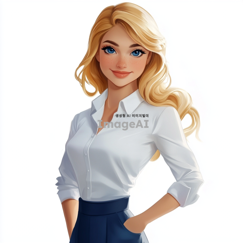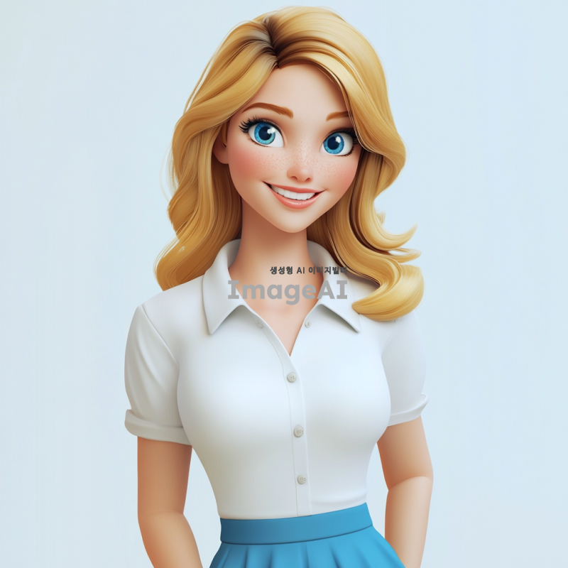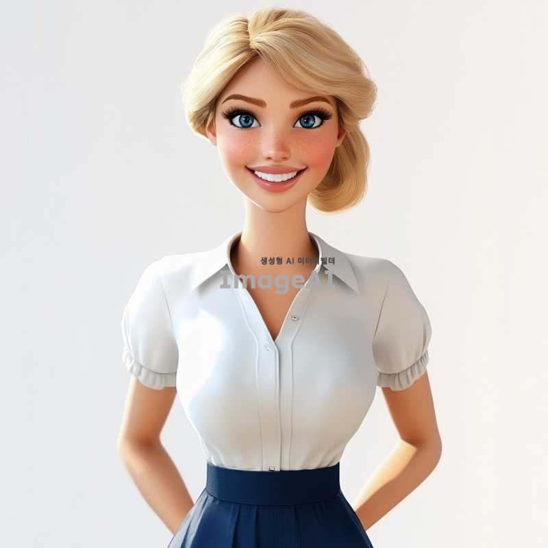 (2.5D 애니메이션) 여성, 금발, 푸른 눈, 환한 미소, 하얀 블라우스, 파란 스커트, 하얀 배경