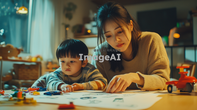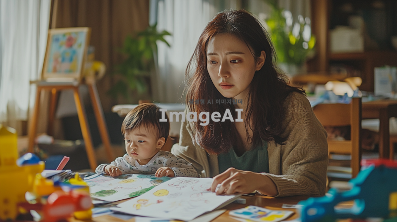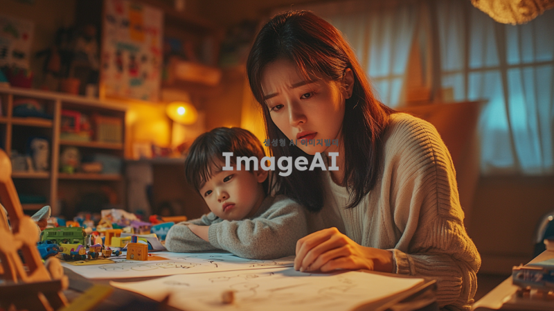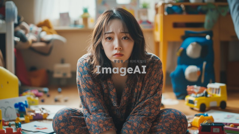 육아에 지친 한국 여성의 모습, 피곤한 표정, 집안에서 아이를 돌보며 잠시 휴식을 취하는 모습, 주변에는 장난감과 아이의 그림이 어지럽혀져 있음, 따뜻한 조명 아래에서 편안한 옷을 입고 있는 모습, 감정이 담긴 눈빛, 현실적인 상황을 담아낸 일상적인 분위기