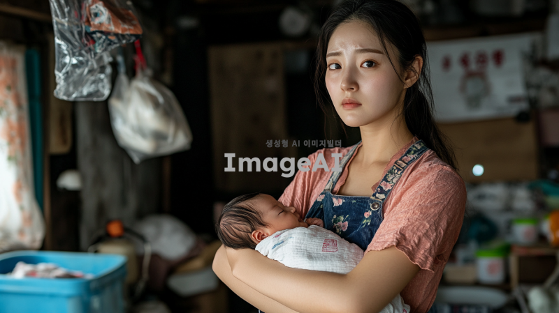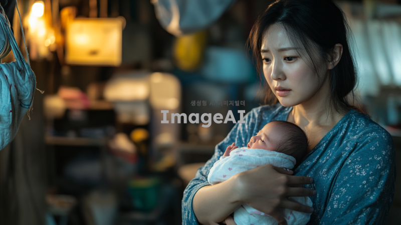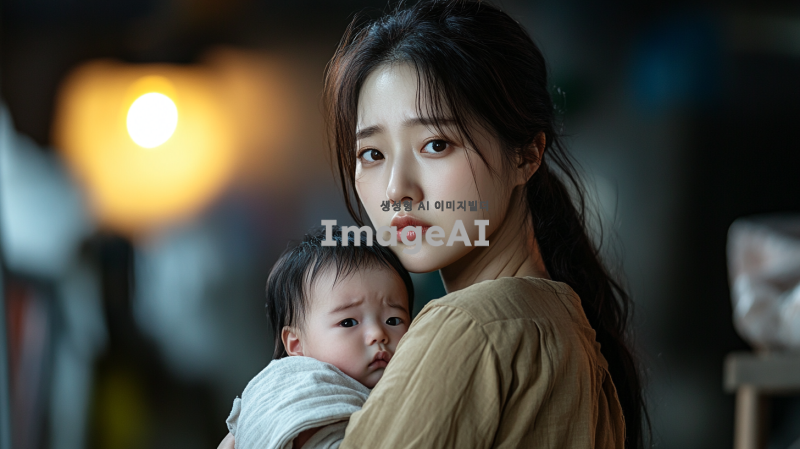 갓난 아기를 품에 안고 육아에 지쳐 보이는 한국인 여성의 모습. 피곤한 표정과 함께 아기를 돌보며 일상적인 집안 배경이 함께 어우러진 장면. 여성의 머리카락은 자연스럽게 흘러내리고, 편안한 옷을 입고 있으며, 아기는 귀여운 포즈로 엄마를 바라보고 있음. 따뜻한 조명 아래에서 가족의 사랑과 헌신이 느껴지는 순간.