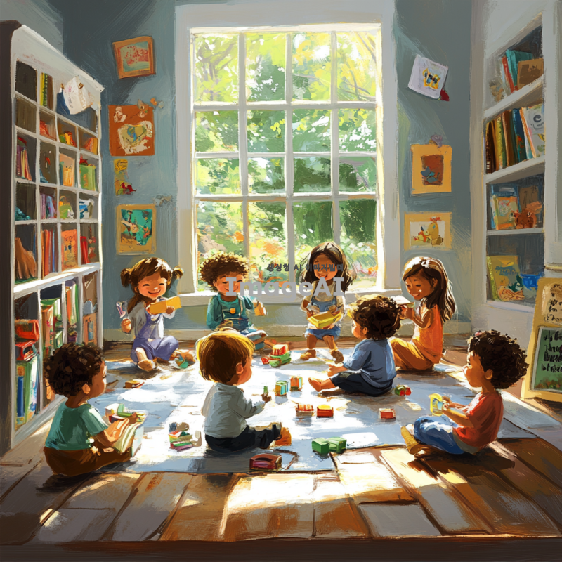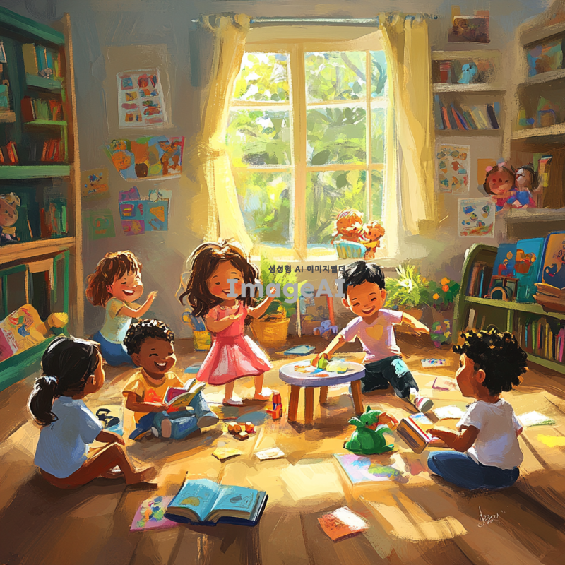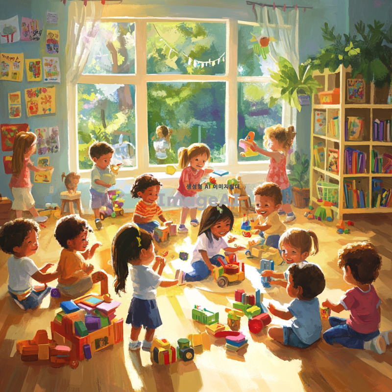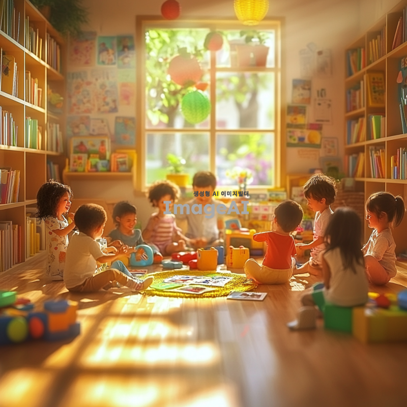 어린이집에서 아이들이 꿈을 키우는 모습을 담은 장면, 밝고 따뜻한 분위기, 다양한 인종의 어린이들이 함께 놀고 있는 모습, 책과 장난감이 가득한 교실, 창밖으로 햇살이 비추는 모습, 아이들이 서로 협력하며 놀이를 즐기는 모습, 행복한 표정과 웃음이 가득한 장면