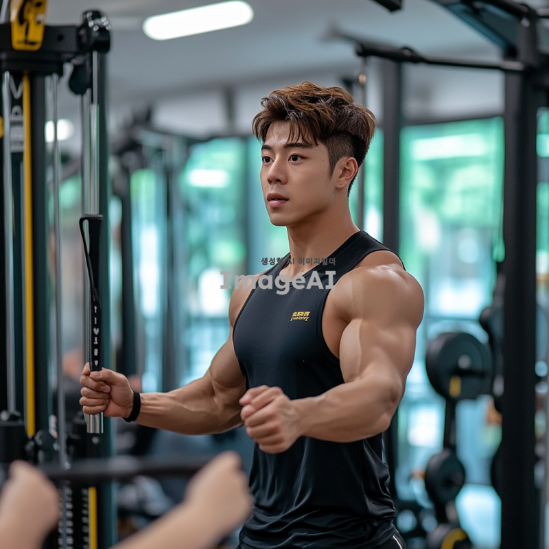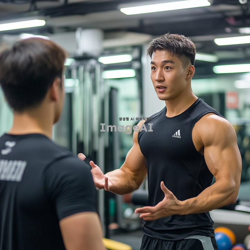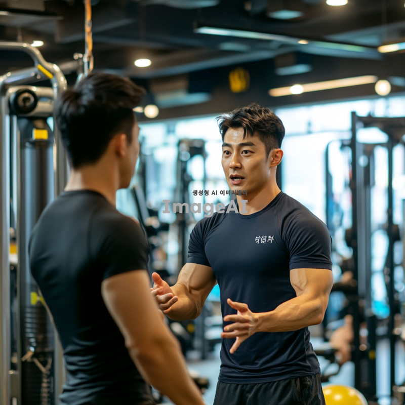 한국의 퍼스널 트레이너가 헬스장 안에서 운동을 지도하고 있는 모습. 트레이너는 근육질의 체형을 가지고 있으며, 운동복을 입고 있다. 다양한 운동 기구가 배경에 있고, 클라이언트와의 소통을 통해 운동 자세를 교정하는 장면을 포착한다. 밝고 활기찬 분위기에서 트레이너의 전문성과 열정이 느껴지도록 표현한다.