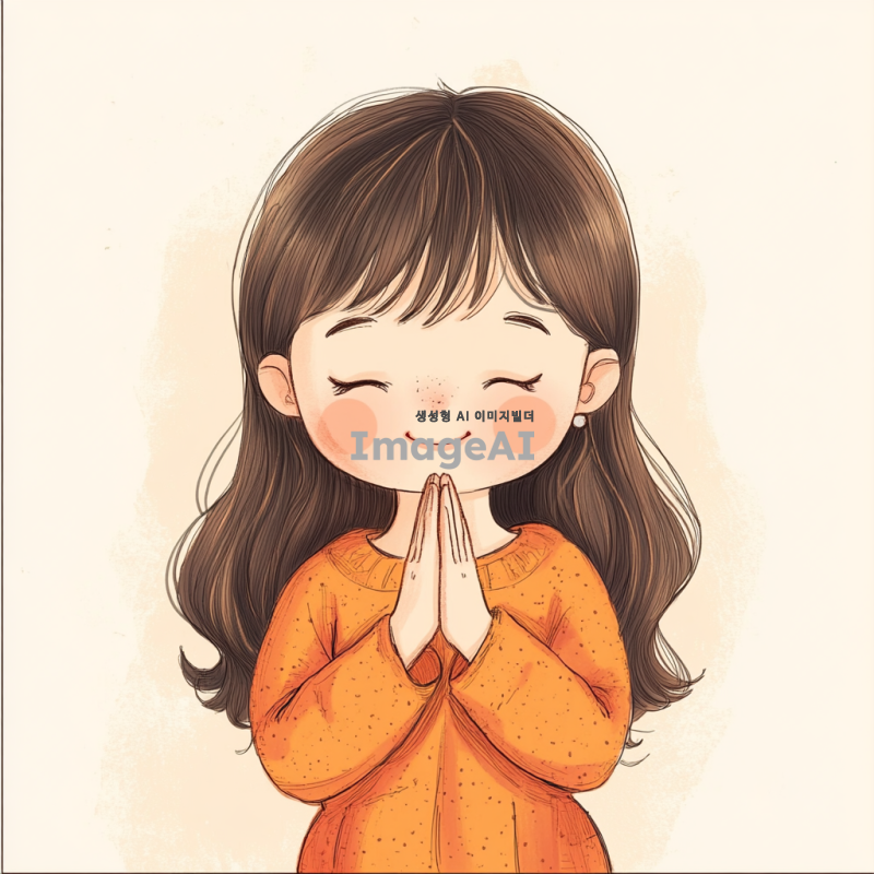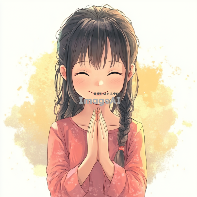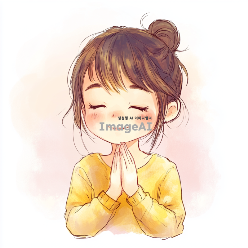 아무 배경 없이, 새해 소망을 기도하는 귀여운 여자 아이의 모습. 따뜻하고 손그림 느낌의 깔끔한 스타일2D 일러스트로, 아이는 밝고 행복한 표정을 지으며 두 손을 모으고 기도하는 자세.