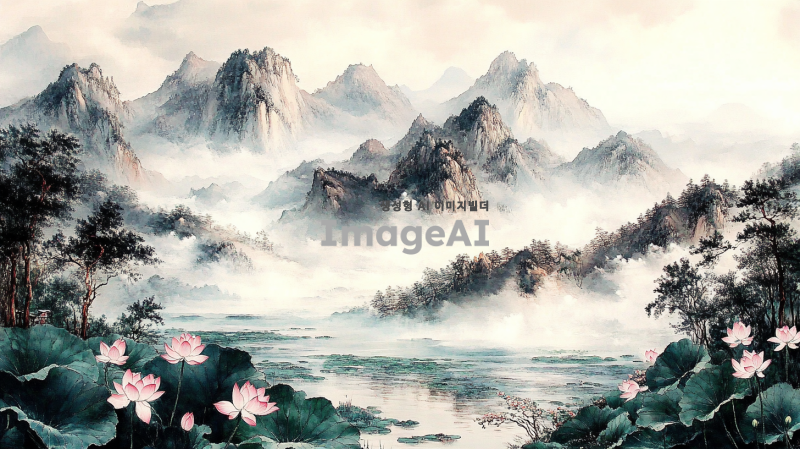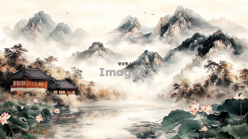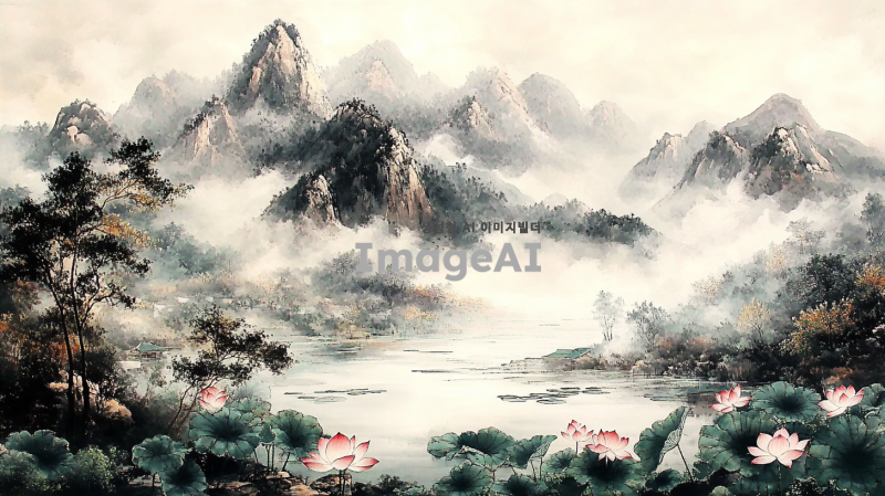 한국 전통 산수화 스타일의 풍경, 푸르른 산과 흐르는 강, 고요한 물가에 피어나는 연꽃, 전통 한옥이 어우러진 아름다운 자연, 부드러운 색감과 섬세한 붓터치, 고요한 분위기와 함께 한국의 전통미를 잘 표현한 장면