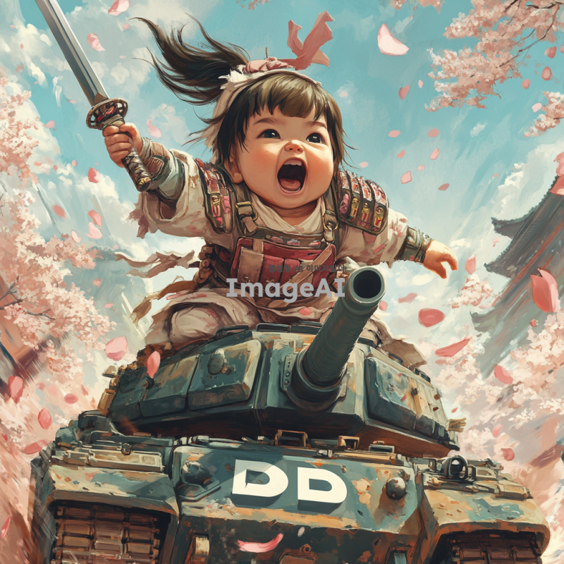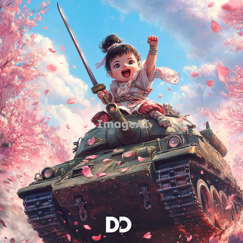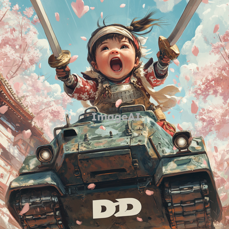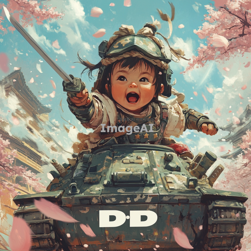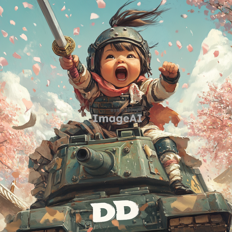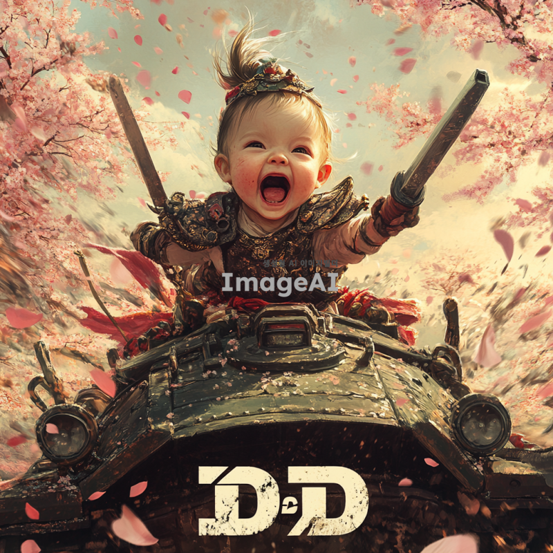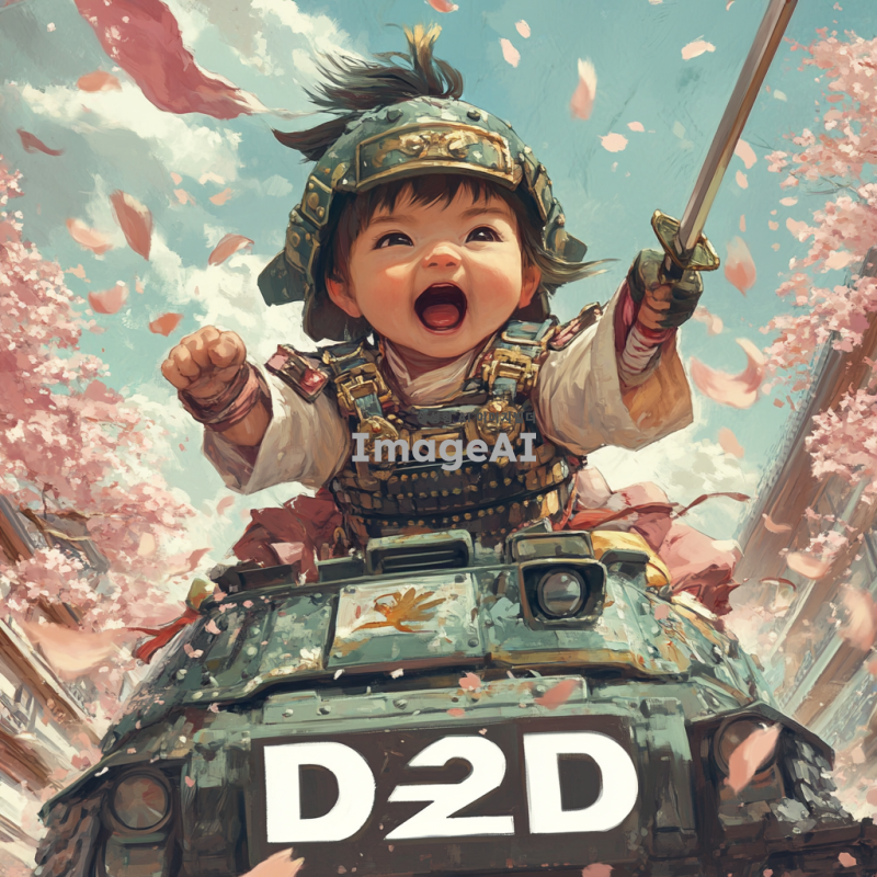 벚꽃잎이 휘날리는 아름다운 배경에서 탱크를 타고 있는 여자 아기 전사가 칼을 앞으로 내밀며 전진하라고 외치고 있는 모습. 아기는 멋진 갑옷을 착용하고 있으며, 하부에는 흰색으로 'd2d'라는 글자가 임팩트 있게 들어가 있다.