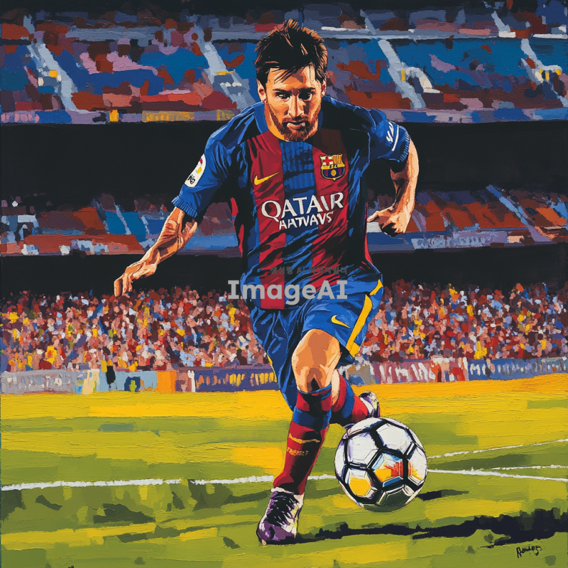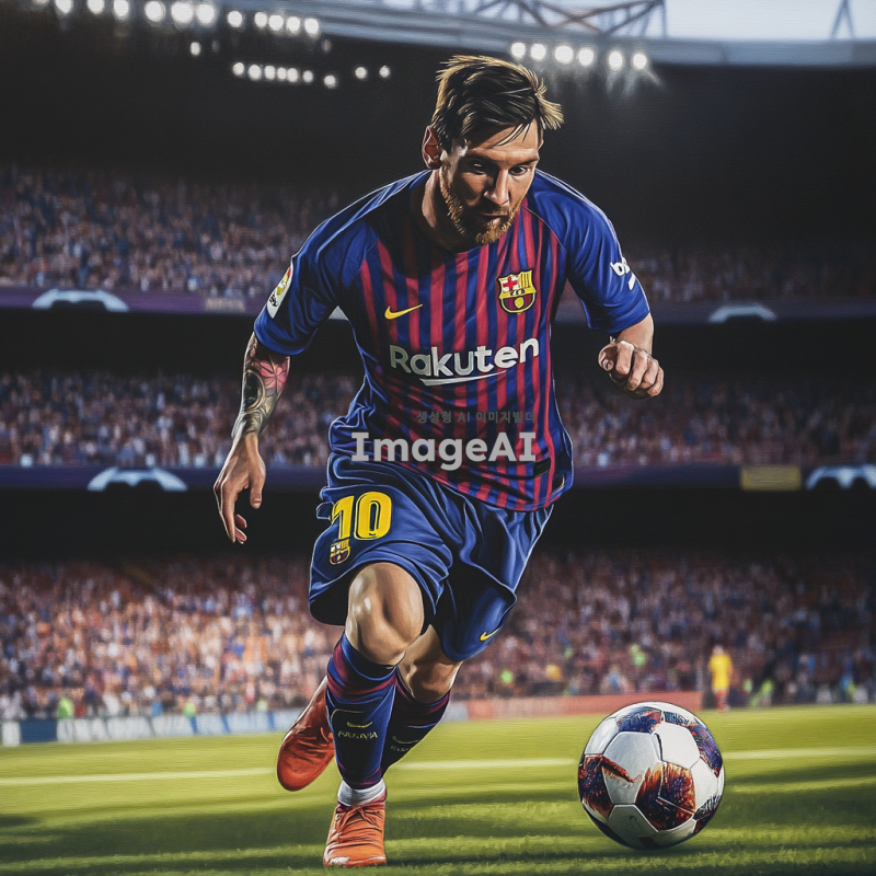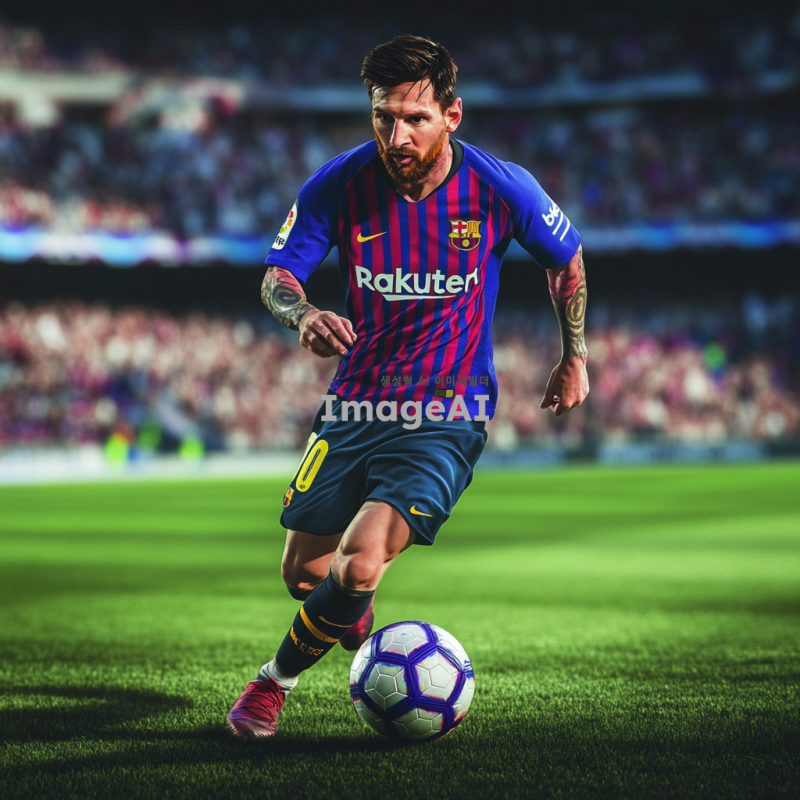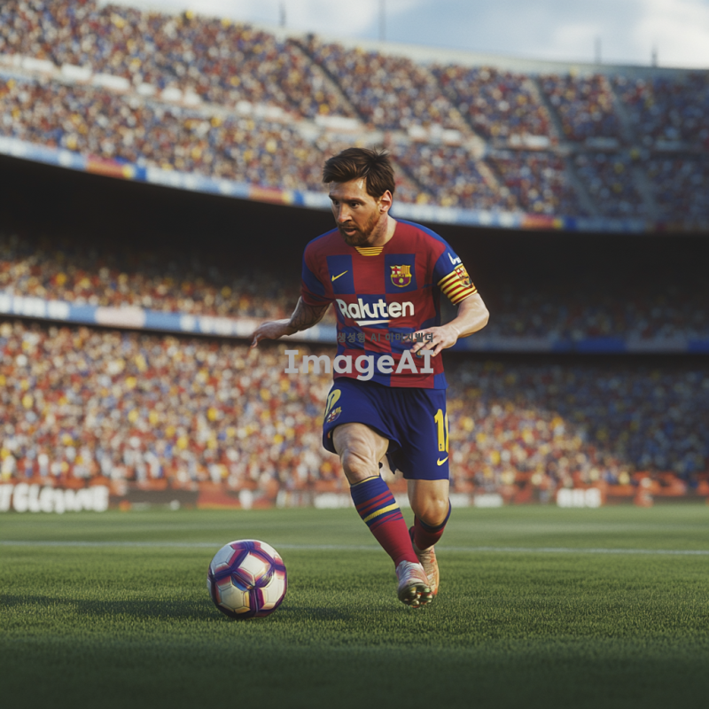 리오넬 메시, 축구 경기 중 드리블을 하며 공을 차고 있는 모습, 스페인 바르셀로나의 경기장 배경, 강렬한 표정과 집중한 눈빛, 유니폼은 바르셀로나 팀 컬러, 관중들이 열광하는 모습, 역동적인 포즈, 생생한 색감, 스포츠의 에너지를 느낄 수 있는 장면