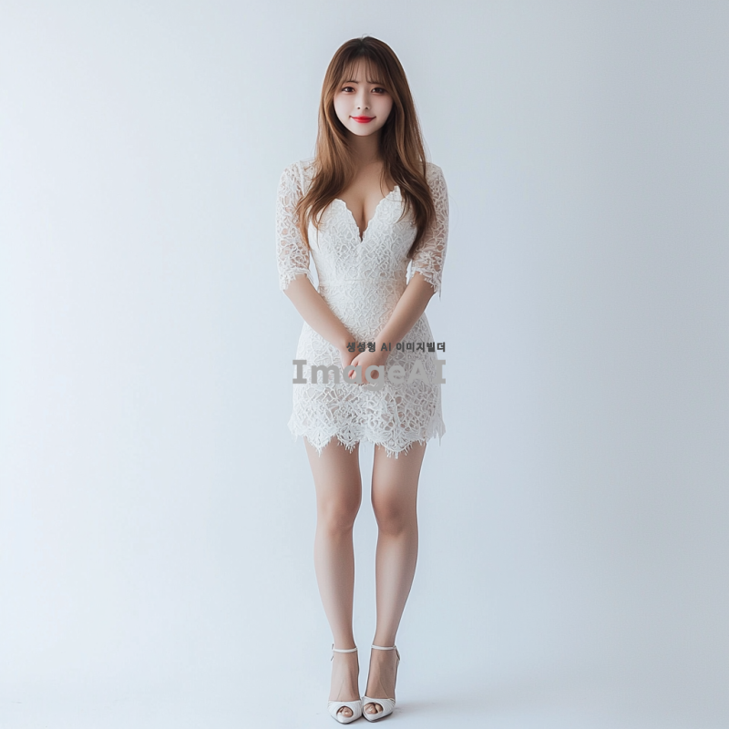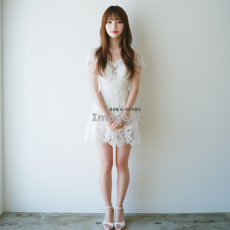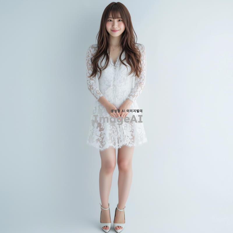 매력적인 일본 여성의 전신 사진, 흰색 레이스 드레스와 하이힐을 신고 있다. 그녀는 얼굴을 감싸는 앞머리와 긴 머리를 가지고 있으며, 카메라를 향해 부드럽게 미소 짓고 있다. 배경은 그녀의 특징을 강조하기 위해 단순한 흰색이다. 그녀의 자세는 카메라 앞에서 자신감을 발산하며 곧게 서 있다.