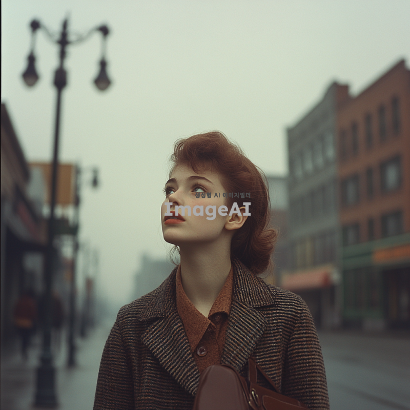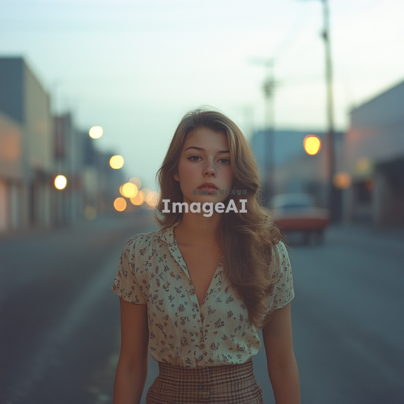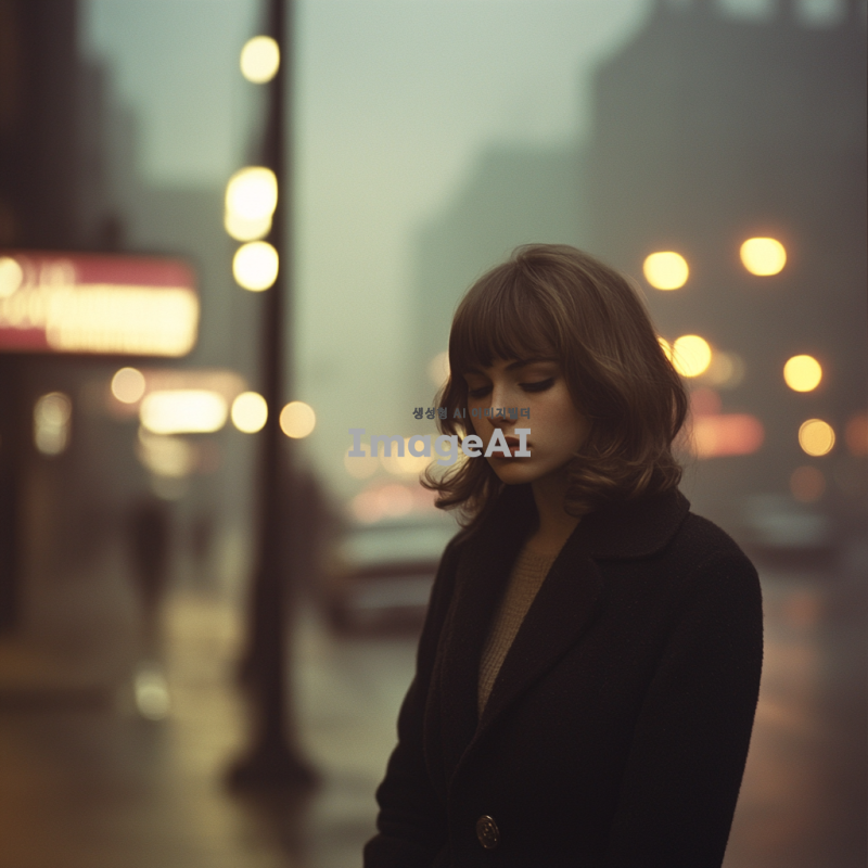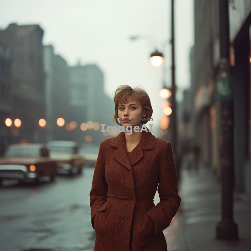 60년대 미국의 쓸쓸한 거리에서 걷고 있는 20대 젊은 여성. 그녀는 락스타의 여자친구로, 우수에 찬 슬픈 표정을 짓고 있다. 거리의 배경은 빈티지한 건물과 가로등, 그리고 흐릿한 하늘이 어우러져 쓸쓸한 분위기를 자아낸다. 그녀의 복장은 60년대 스타일의 패션으로, 세련되면서도 약간의 우울함을 느낄 수 있는 느낌이다.