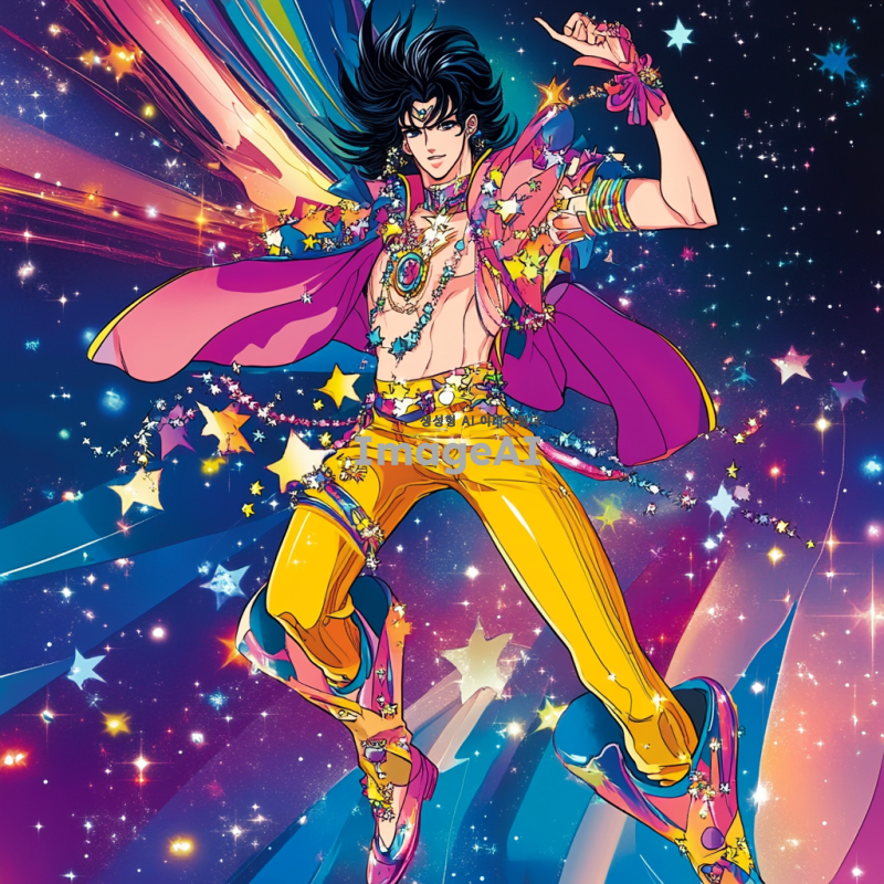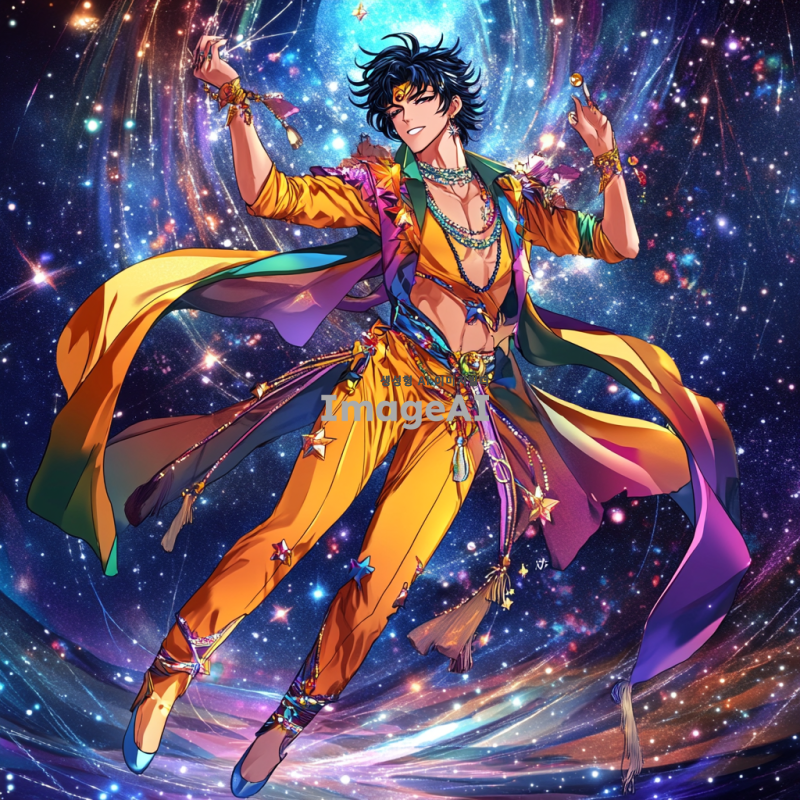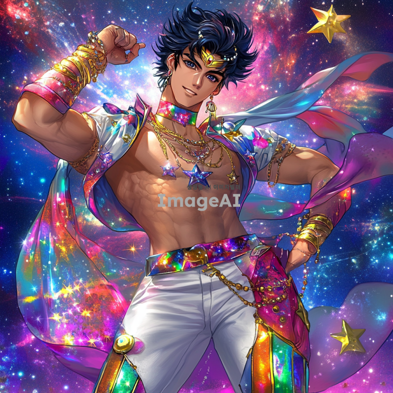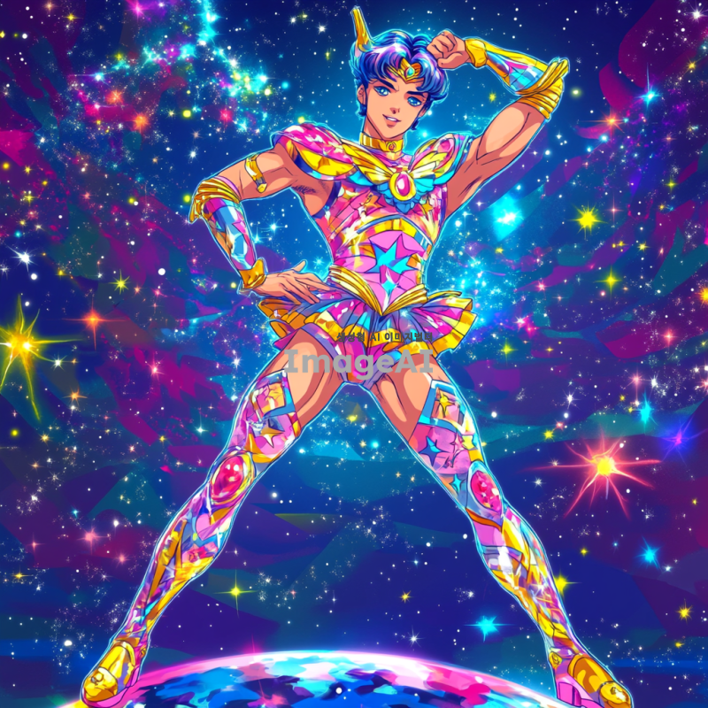 세일러문 스타일의 남자 캐릭터, 화려한 의상을 입고 있고, 별과 달의 테마가 있는 장식, 우주 배경, 강력한 포즈를 취하고 있으며, 카리스마 있는 표정, 일본 애니메이션 스타일, 밝고 생동감 있는 색상으로 표현된 모습.