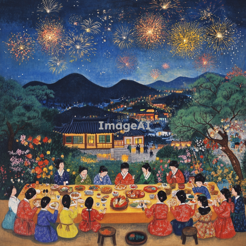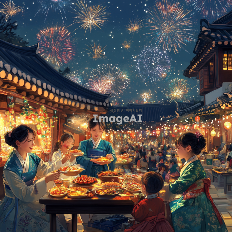 2025년 뱀의 해를 맞아 축하하는 한국 전통 새해 풍경, 화려한 뱀 모티프의 장식과 함께 새해를 기념하는 사람들, 전통 한복을 입은 가족들이 모여 웃으며 새해 인사를 나누고 있는 모습, 따뜻한 조명과 함께 풍성한 음식들이 차려진 테이블, 배경에는 불꽃놀이가 펼쳐지는 밤하늘, 행복하고 화목한 분위기.