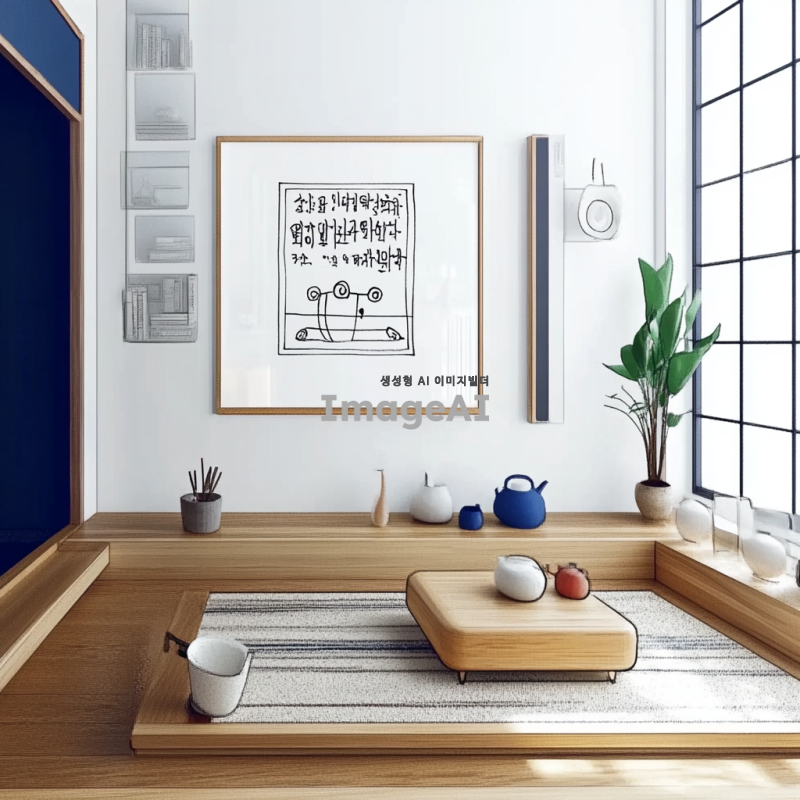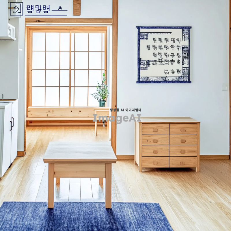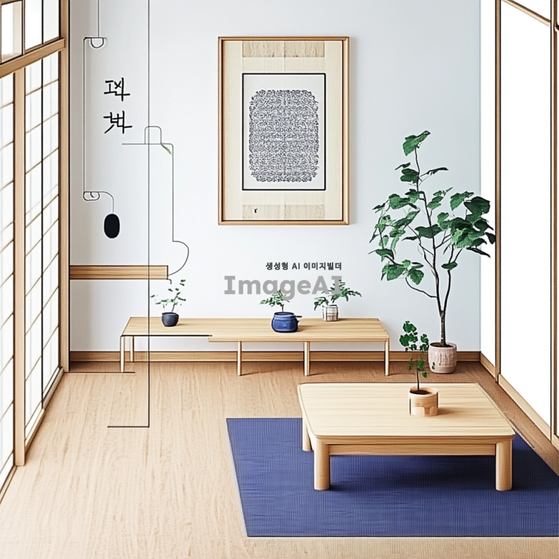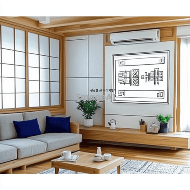 모던한 한국식 거실 인테리어, 따뜻한 목재 가구와 전통적인 요소가 조화롭게 어우러진 공간, 큰 창문을 통해 자연광이 들어오는 모습, 벽에는 한국 전통 문양이 담긴 그림이 걸려있고, 바닥은 아늑한 카페트로 덮여있음, 식물과 장식품이 적절히 배치되어 있는 편안한 분위기.