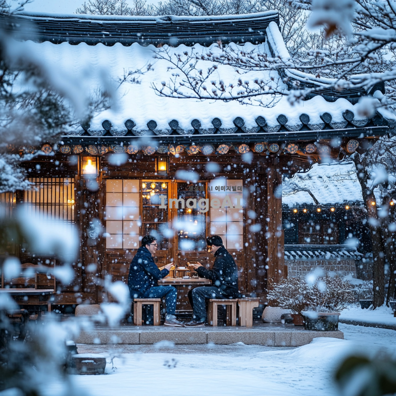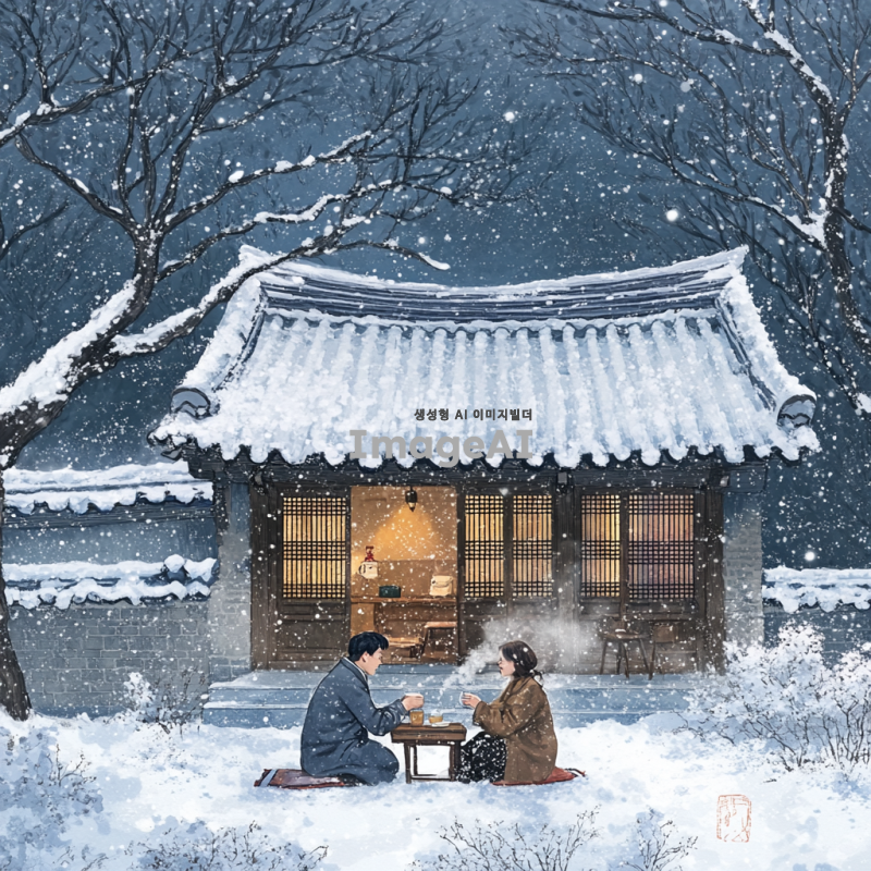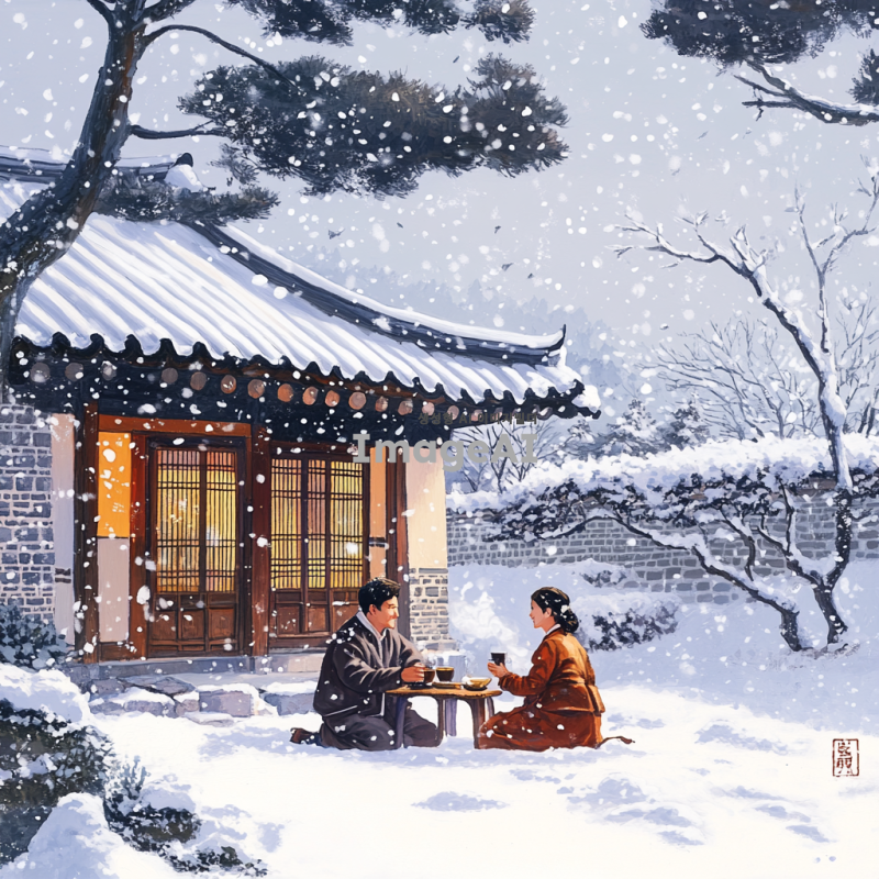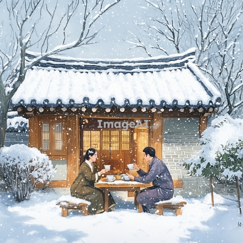 눈이 내리는 날, 한국의 전통 가옥 앞에서 따뜻한 차를 마시는 한국인 남성과 여성, 주변은 하얀 눈으로 덮여 있고, 나무와 지붕 위에도 눈이 쌓여 있는 모습, 부드러운 조명 아래에서 아늑한 분위기를 연출, 겨울의 정취를 느낄 수 있는 장면.