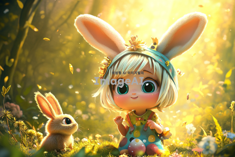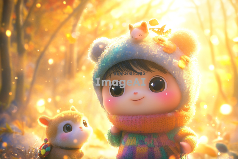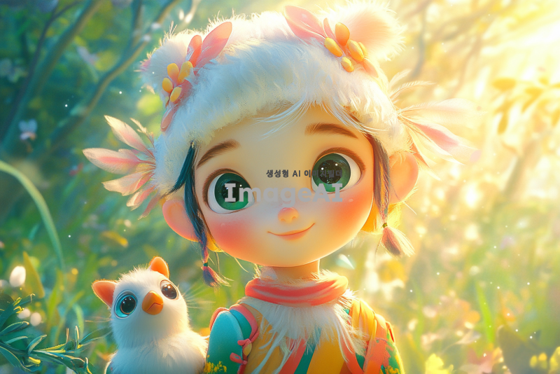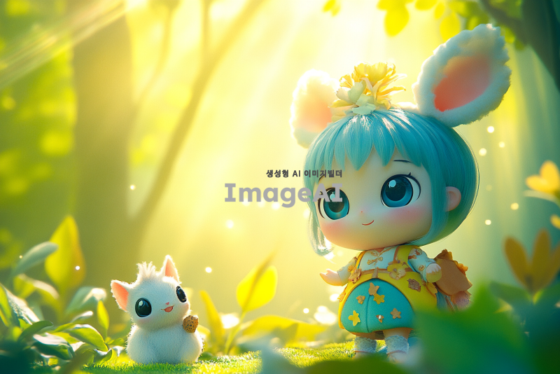 귀엽고 사랑스러운 애니메이션 캐릭터, 큰 눈과 부드러운 표정, 화려한 색상의 의상, 작은 동물 친구와 함께하는 모습, 배경은 환상적인 숲, 따뜻한 햇살이 비치는 장면, 전체적으로 아기자기하고 귀여운 느낌으로.