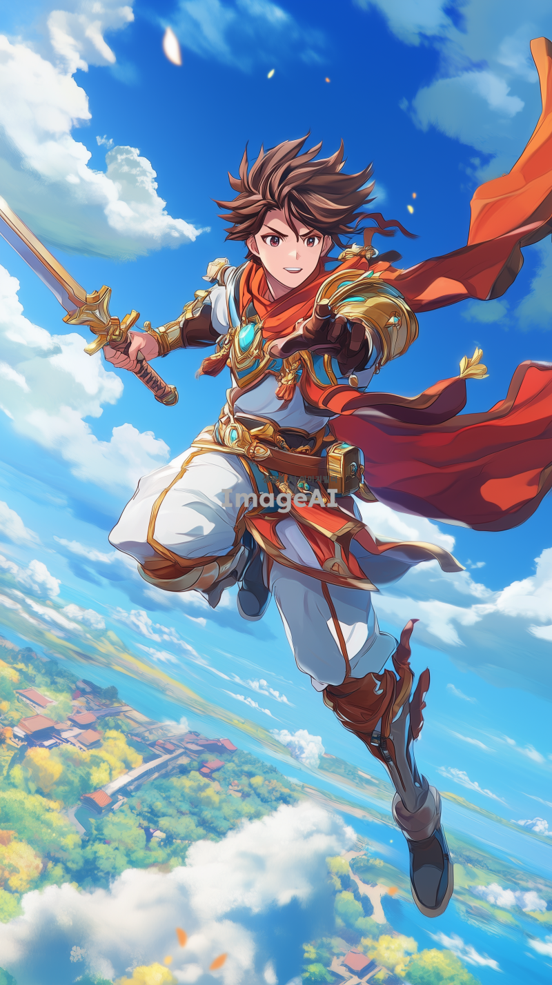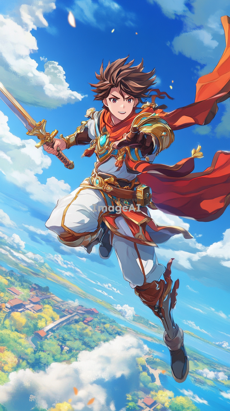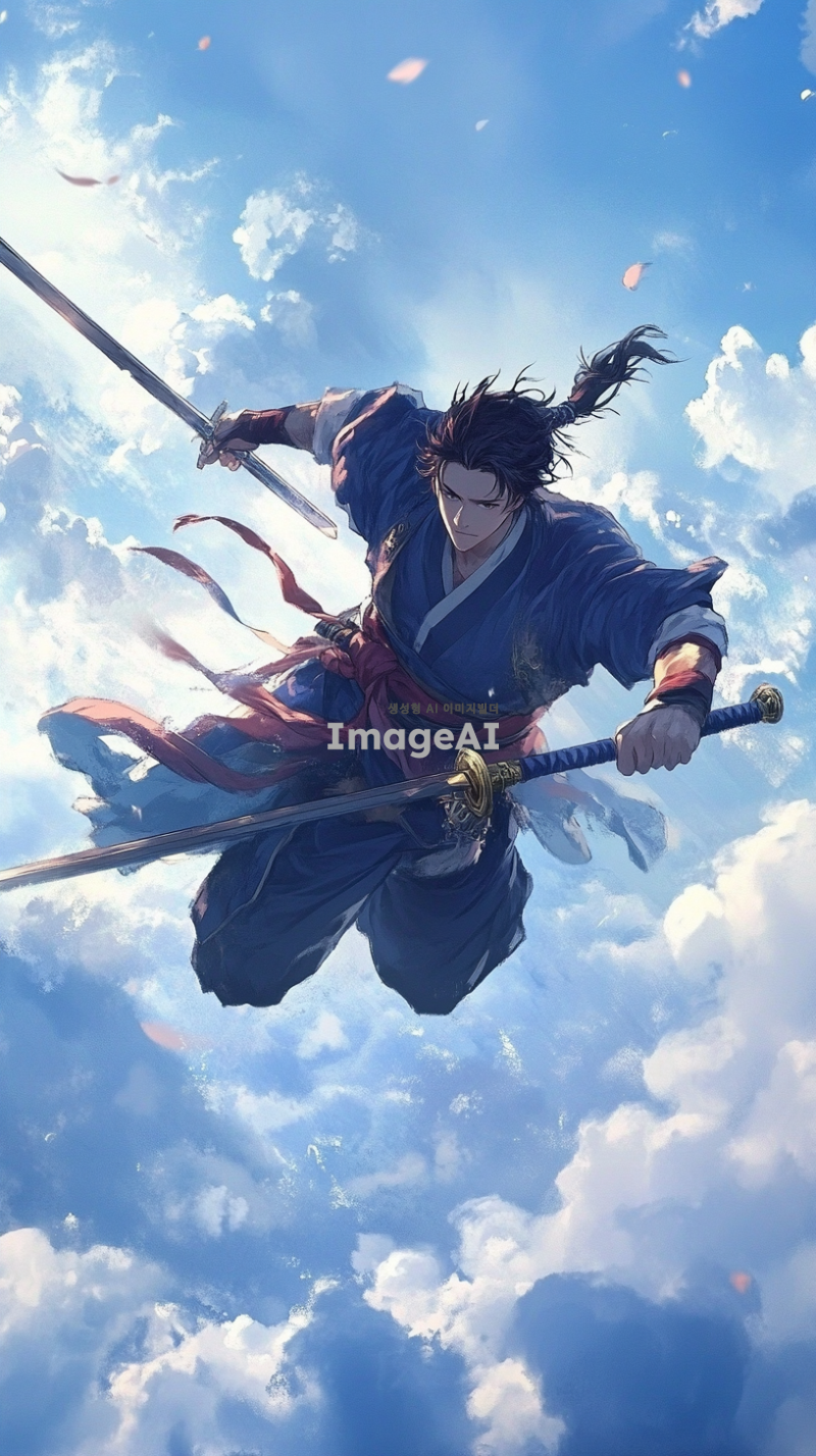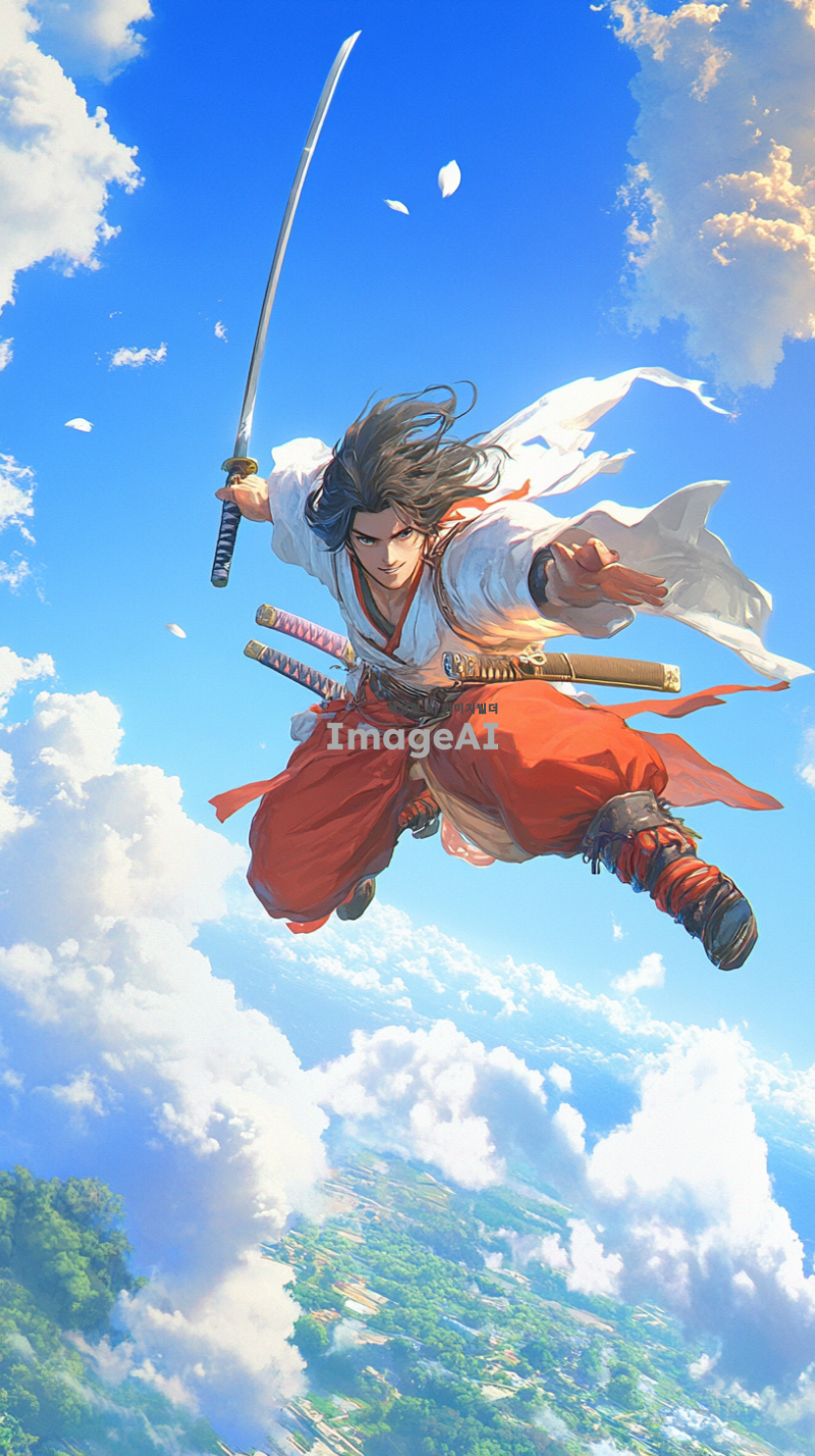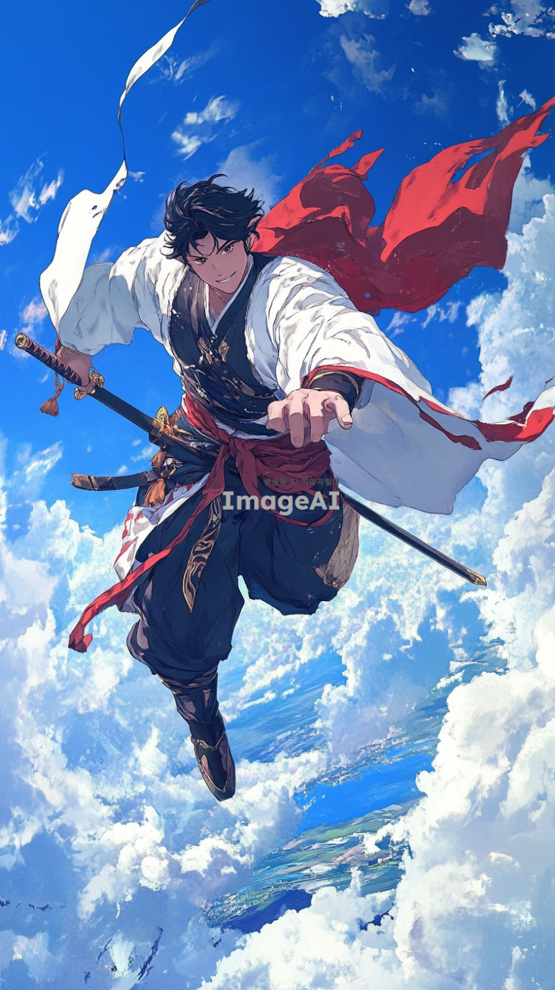 현실 세계에서 이세계 왕국으로 날아오고 있는 남자 용사 주인공의 모습, 강한 의지를 가진 표정, 긴 검을 들고 하늘을 향해 날아오르는 자세, 배경은 푸른 하늘과 구름, 2D 애니메이션 스타일, 화려한 색감과 세밀한 캐릭터 디자인, 한국적인 요소가 가미된 의상과 장비