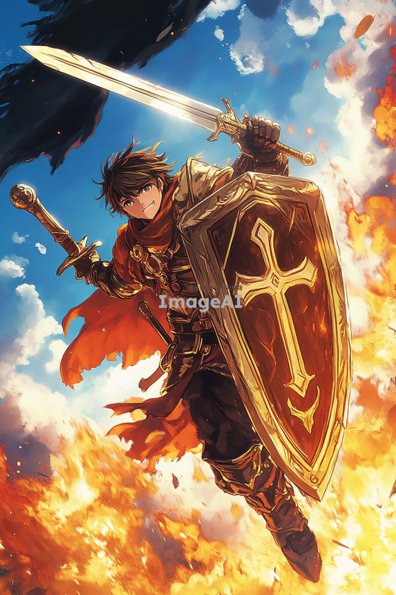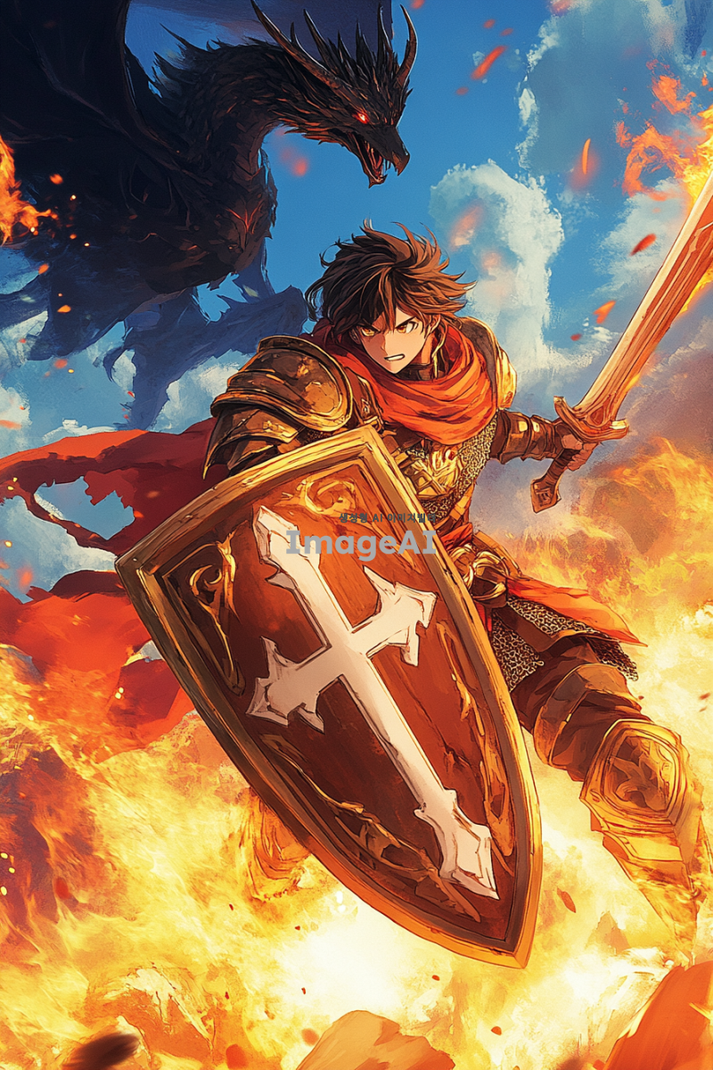 이세계물 소설책 표지에 들어갈 이미지. 남자 용사가 흑룡이 쏘는 불꽃을 커다란 직사각형 방패로 막고 있음. 직사각형 방패에는 십자 모양의 무늬가 있음. 배경은 주변이 모두 불타고 있는 상황. 2D 애니메이션으로 표현해주세요.