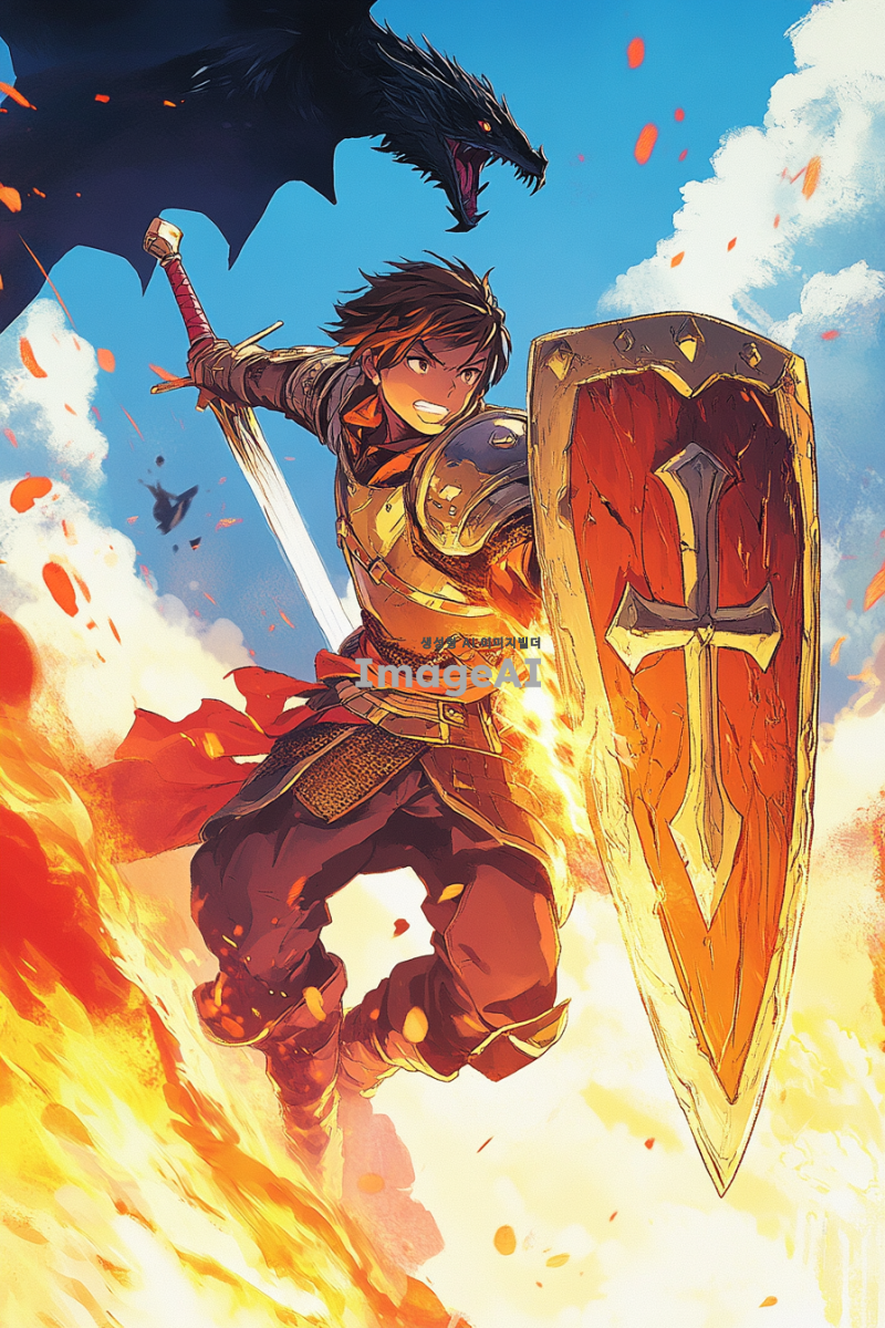 남자 용사가 커다란 직사각형 방패로 흑룡이 쏘는 불꽃을 막고 있는 장면. 방패에는 십자 모양의 무늬가 새겨져 있으며, 주변은 모두 불타고 있는 상황. 2D 애니메이션 스타일로 표현된 이세계물 소설책 표지 이미지.
