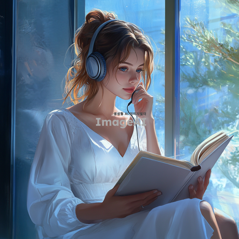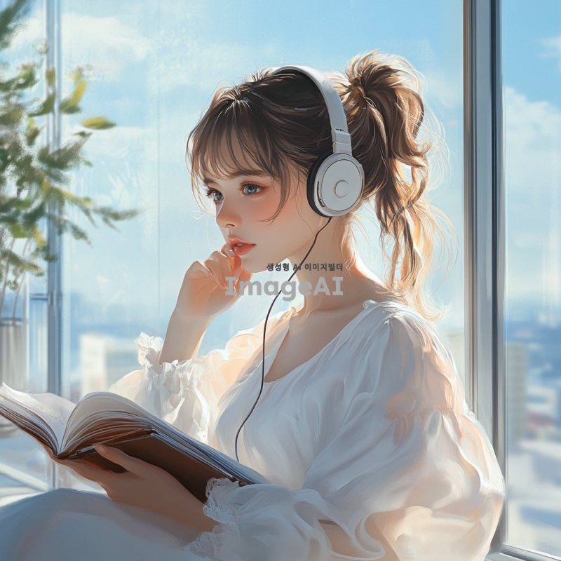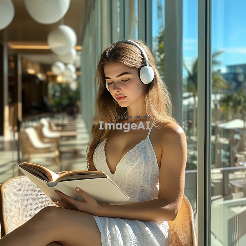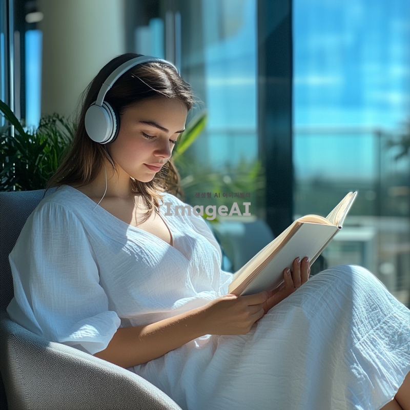 마이크가 달린 헤드폰을 쓰고 흰 원피스를 입은, 오전의 통유리 창가에 앉아 있는 밝은 갈색 머리와 짙은 남색 눈동자를 가진 20살 여성의 모습. 자연광이 들어오는 공간에서 여유롭게 책을 보며 통화하는 듯한 분위기. 배경은 현대적인 인테리어로 꾸며져 있으며, 창밖에는 푸른 하늘과 햇살이 비치는 풍경이 보인다.