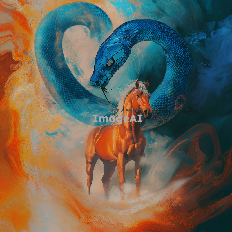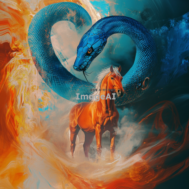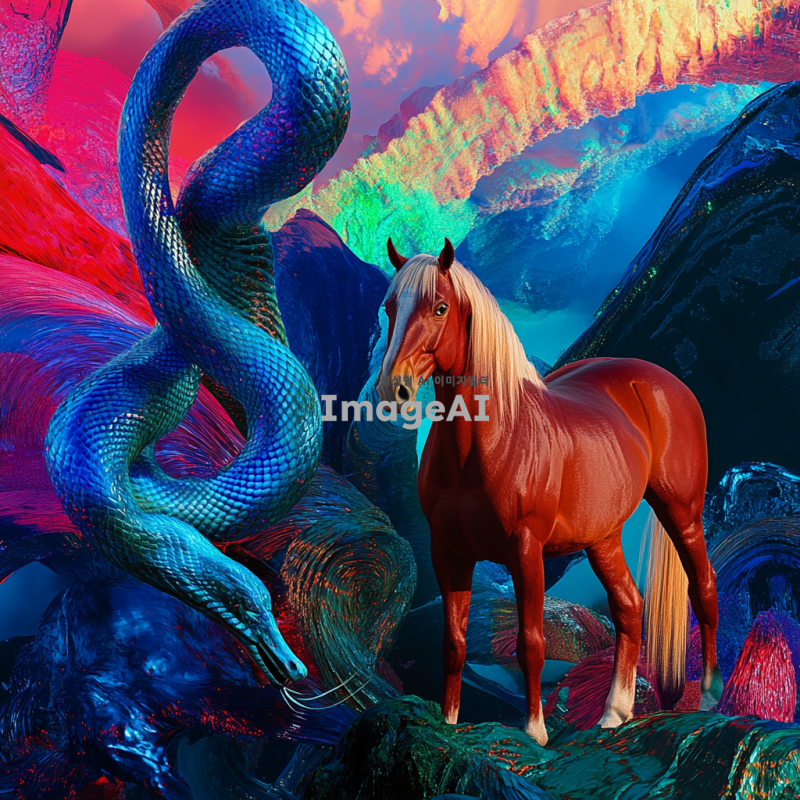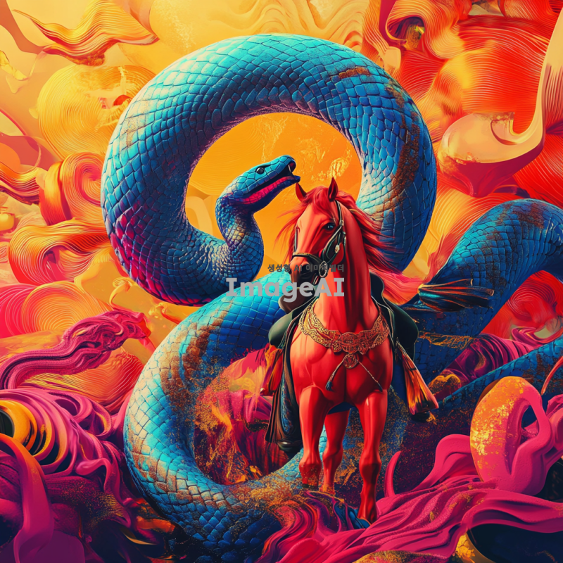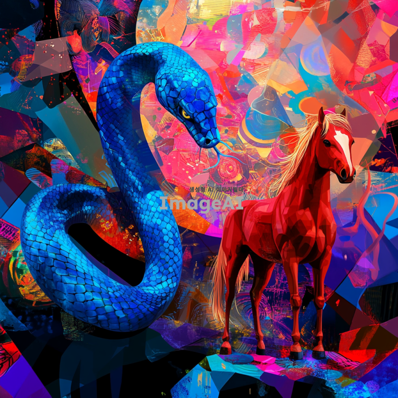 푸른 뱀과 붉은 말을 배경으로 하여, 2025라는 숫자가 눈에 띄게 배치된 그림. 뱀은 신비로운 느낌을 주며, 말은 힘찬 자세로 서 있는 모습. 전체적인 색감은 생동감 있고 화려하게 표현되며, 뱀과 말 사이에 조화로운 배경이 어우러진 장면.