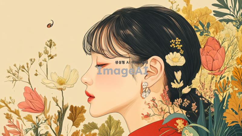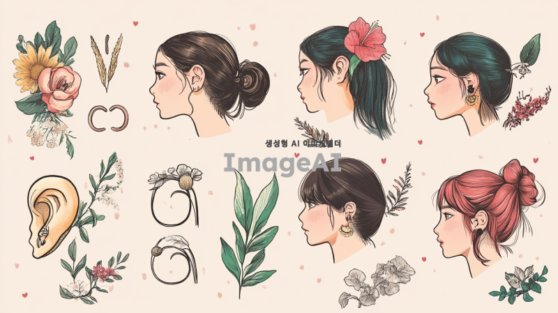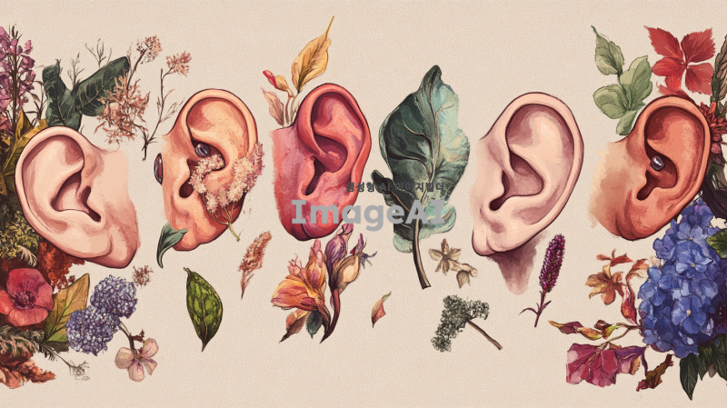 귀를 주제로 한 일러스트를 그려주세요. 다양한 스타일의 귀를 표현하며, 귀의 형태와 디테일을 강조해 주세요. 귀가 여러 가지 색상으로 채색되어 있고, 주변에 자연 요소나 장식이 함께 어우러져 있는 모습으로, 한국적인 느낌이 나는 배경을 추가해 주세요. 귀의 아름다움과 독특함을 잘 나타내는 그림이 되길 바랍니다.