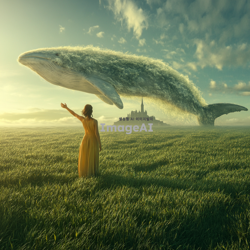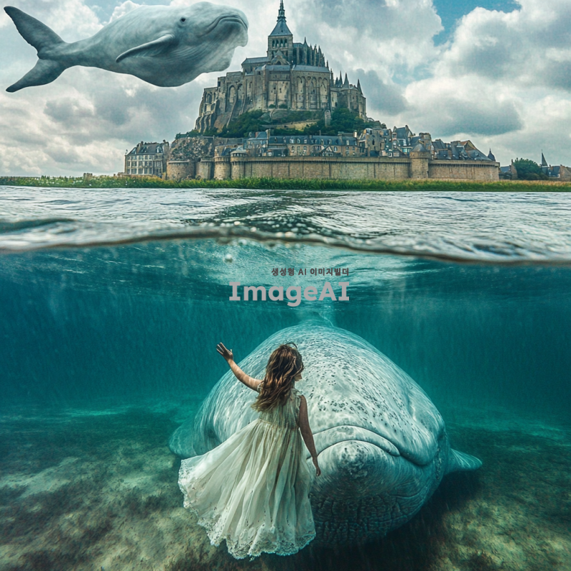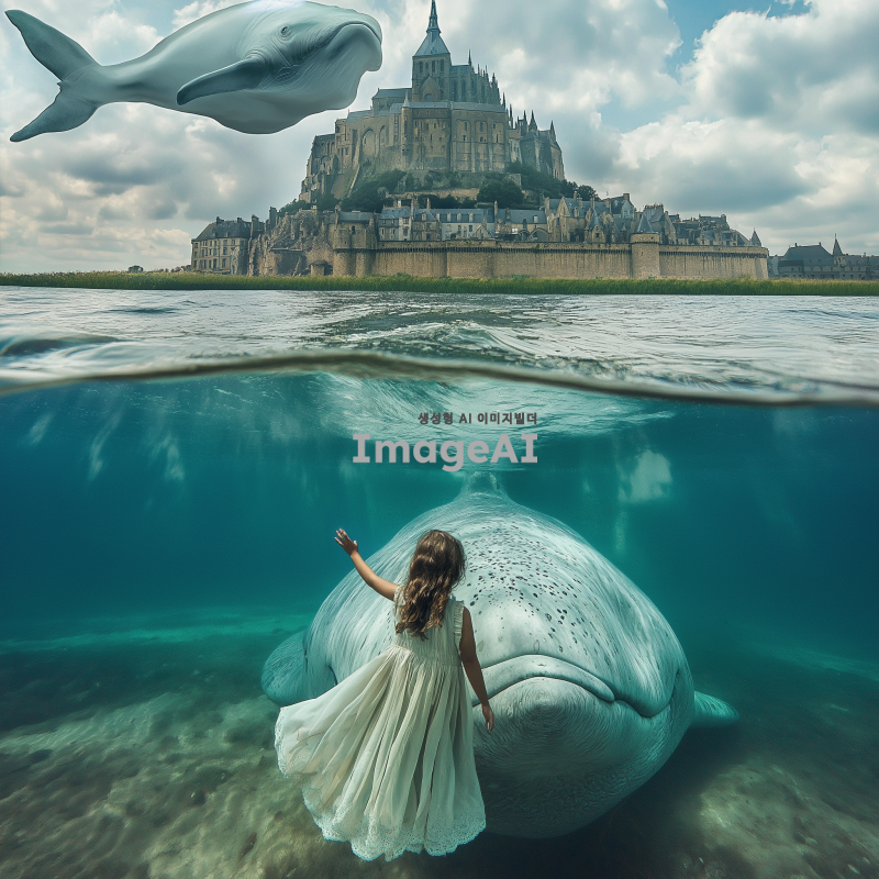 끝없는 초원 한가운데에 서 있는 소녀가 손을 흔들며 우리에게 미소를 짓고 있다. 그녀 앞에는 물속에 잠긴 몽 생 미셸이 있고, 그 위에는 거대한 흰 고래가 떠 있다. 이 초현실적인 사진은 꿈같고 부드러운 조명, 밝은 색상, 복잡한 디테일, 높은 해상도를 특징으로 한다.