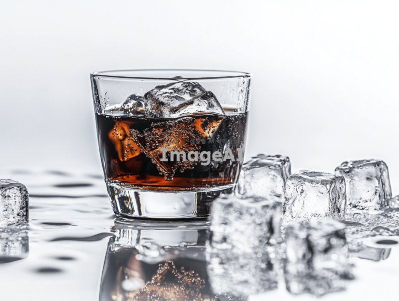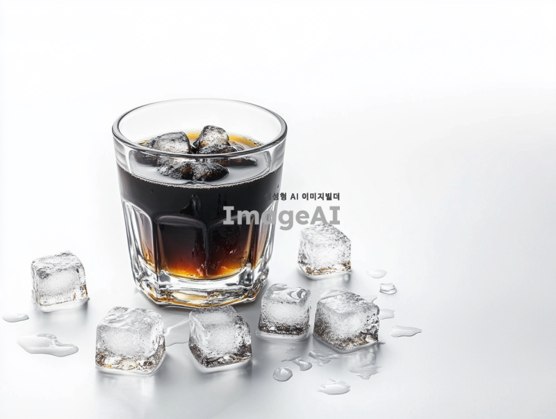차가운 블랙 커피가 얼음 조각과 함께 담긴 유리잔을 흰 배경에 두고 촬영한 고해상도 사진, 고품질 사진, 고화질 리얼리틱, 제품 촬영, 제품 사진, 매우 상세하고 높은 초점의 사진입니다.