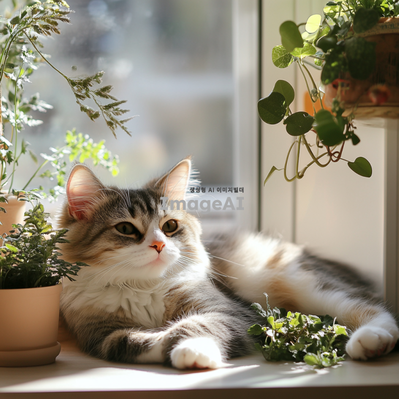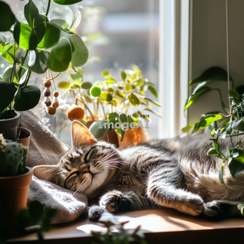 귀여운 고양이가 편안하게 누워 있는 모습, 부드러운 털과 큰 눈, 햇빛이 비치는 창가에서 졸고 있는 장면, 주변에는 아기자기한 장난감과 식물이 있는 아늑한 실내 환경, 따뜻한 색감으로 포근한 분위기 연출.