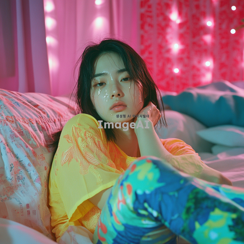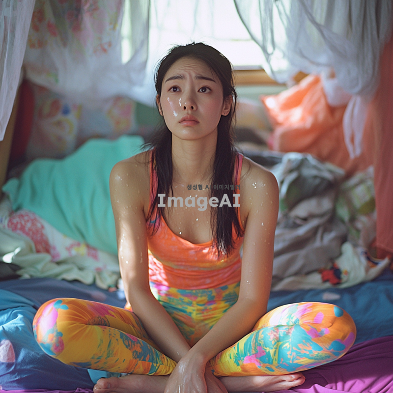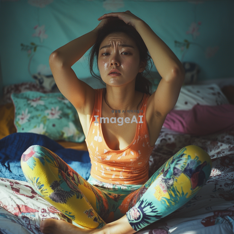 더위에 지쳐 보이는 한국 여성, 밝은 색상의 여름 쫄쫄이를 입고, 땀방울이 맺힌 얼굴, 주변에는 침대로 이루어져 있고, 긴장된 표정으로 더위를 즐기는 모습