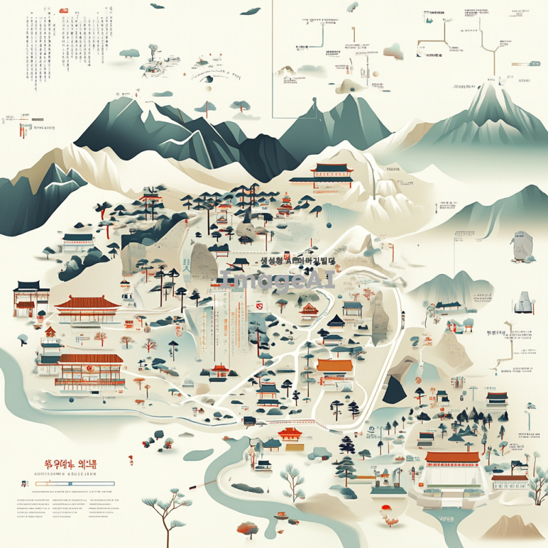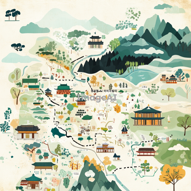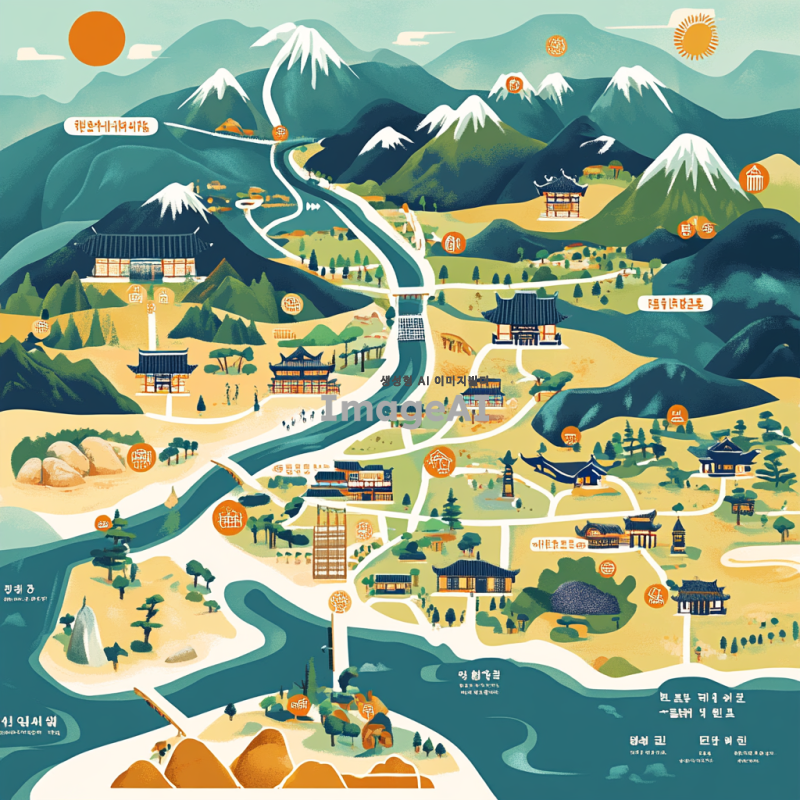 지도의 기호를 설명하는 장면, 다양한 지형과 지물들이 시각적으로 표현된 지도 위에 기호들이 배치되어 있는 모습, 산, 강, 도로, 도시 등의 아이콘이 포함된 지도, 색상이 조화롭게 어우러진 디자인, 한국의 자연 경관과 도시 풍경이 함께 어우러진 모습, 명확하고 이해하기 쉬운 기호와 설명이 함께 있는 지도.