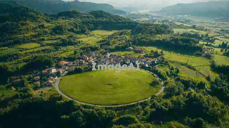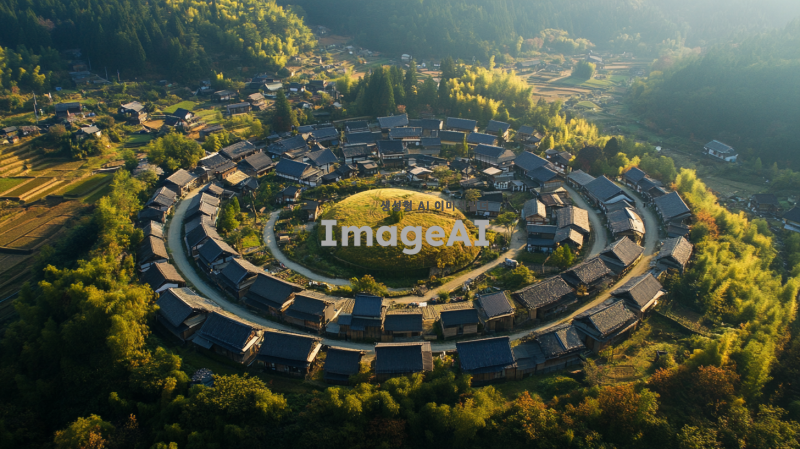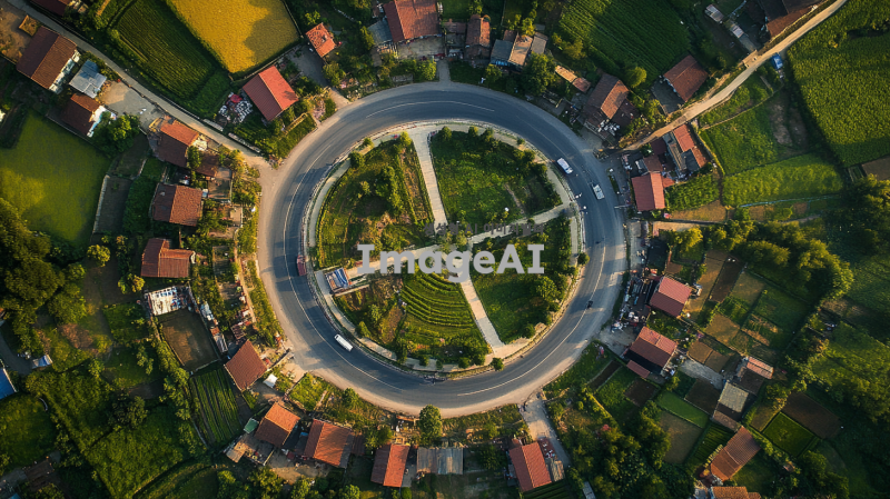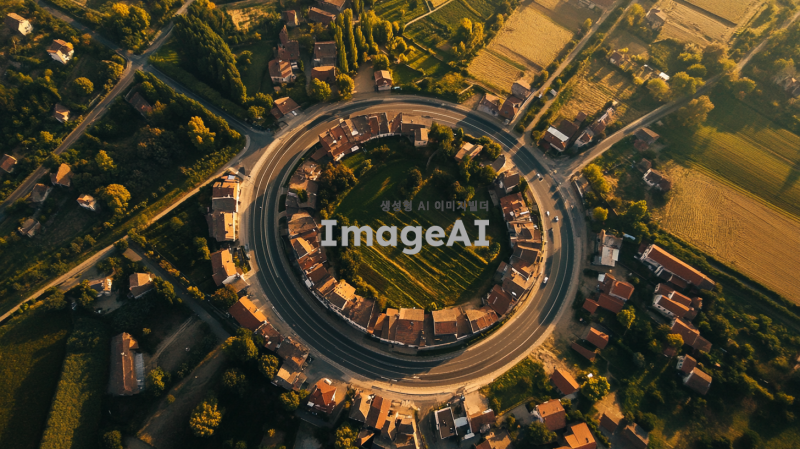 모든 길이 하나의 장소로 모이는 동그란 형태의 마을인데 길이 도드라지게 표현해줘