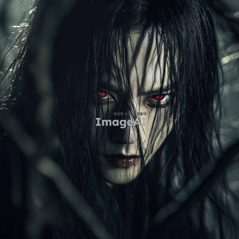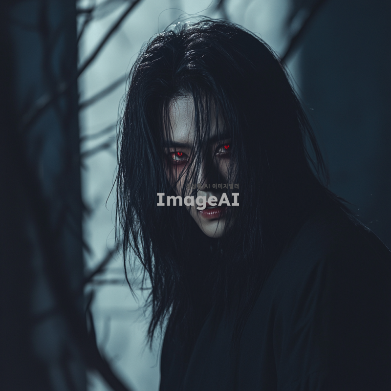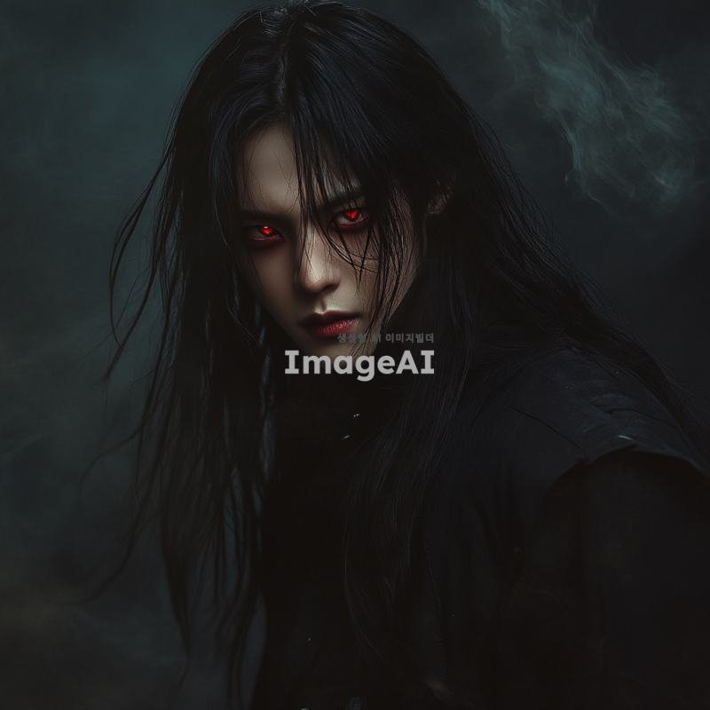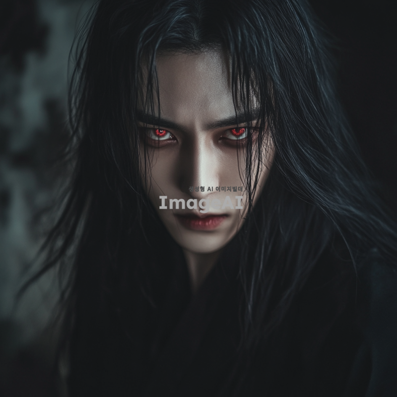 눈이 빨갛고 악마같이 생긴 한국인 남성이 어두운 배경 속에서 신비롭게 서 있는 모습, 긴 검은 머리카락과 날카로운 얼굴선, 강렬한 표정으로 카메라를 응시하고 있는 모습, 주변에는 흐릿한 그림자와 불길한 분위기가 감도는 장면.