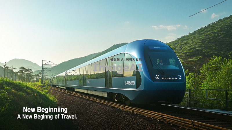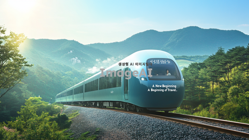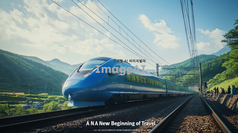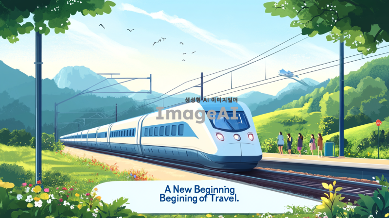한국의 아름다운 자연 경관을 배경으로 한 현대적인 기차가 달리는 모습, 기차의 창문 너머로 보이는 푸른 산과 맑은 하늘, 기차의 디자인은 세련되고 미래지향적이며, 주변에는 여행하는 사람들의 즐거운 표정이 담겨있고, "여행의 새로운 시작"이라는 슬로건이 포함된 광고 포스터 스타일.