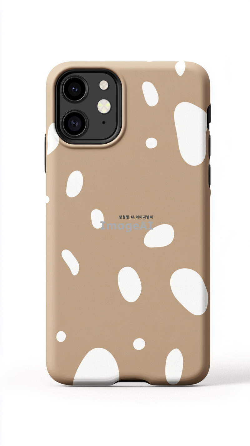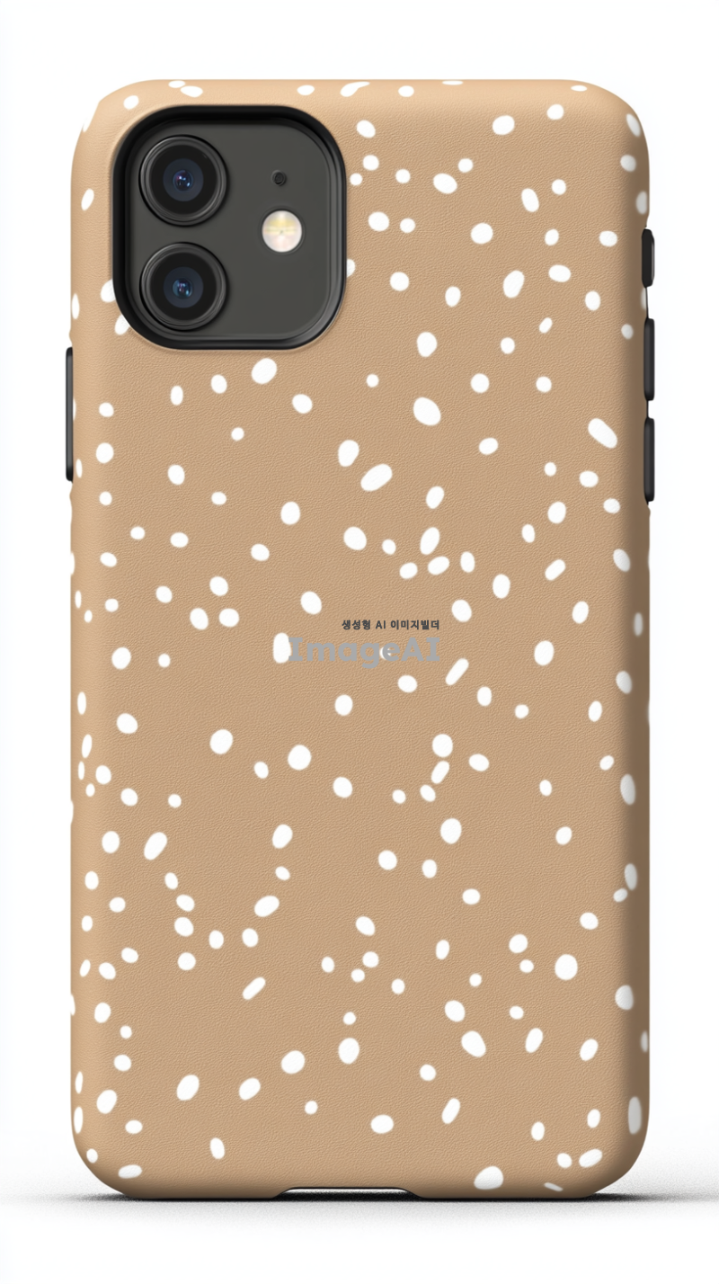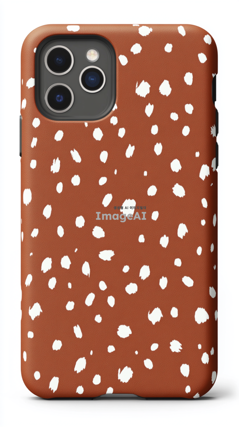 갈색 배경에 흰색 도트 패턴이 있는 핸드폰 케이스 디자인, 도트는 다양한 크기로 배열되어 있으며, 전체적으로 세련되고 현대적인 느낌을 주는 스타일로 표현해 주세요.