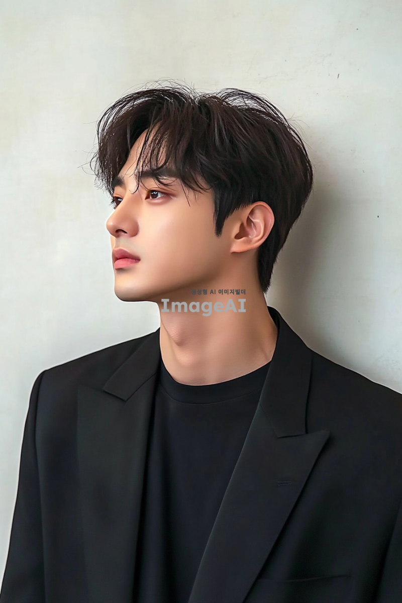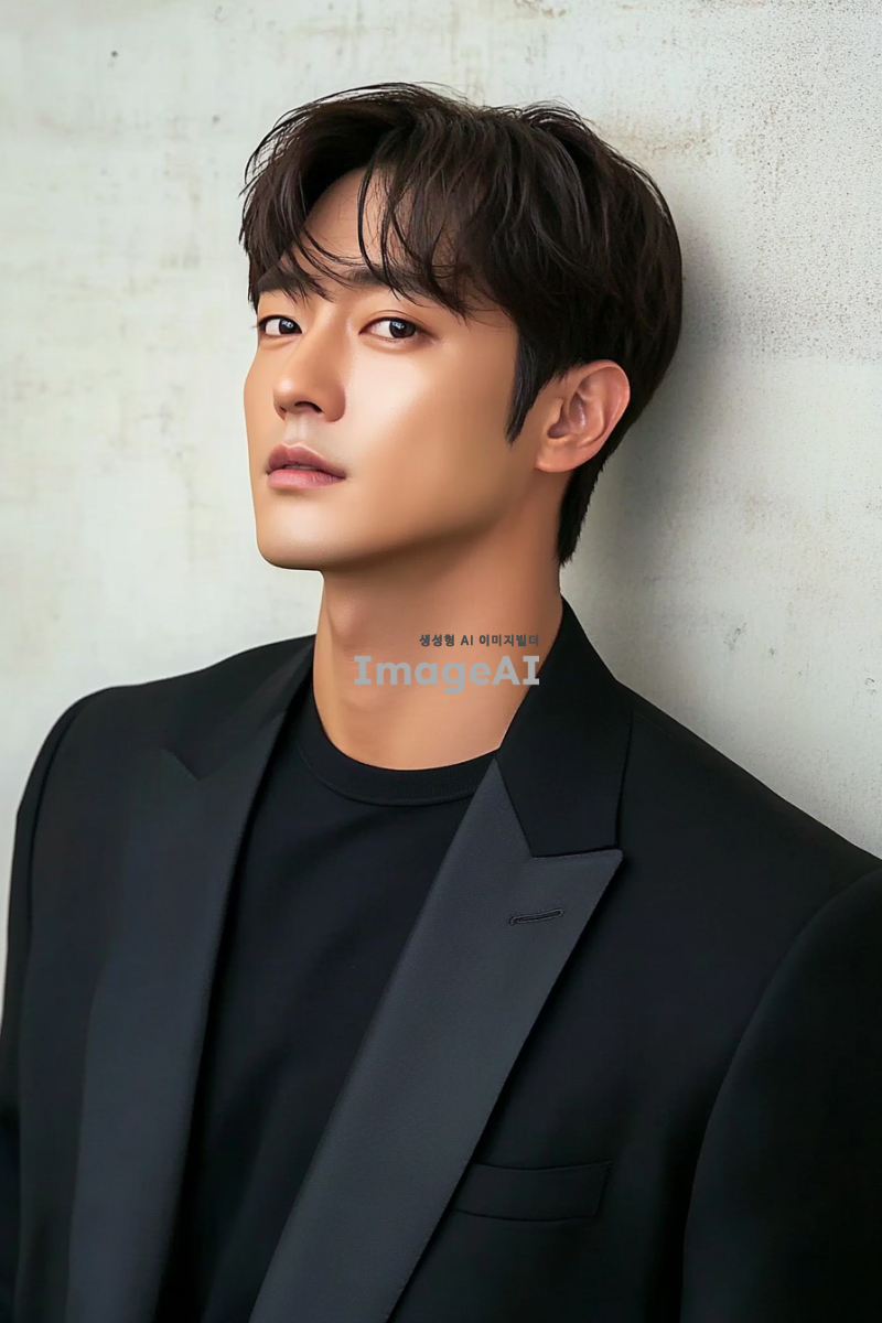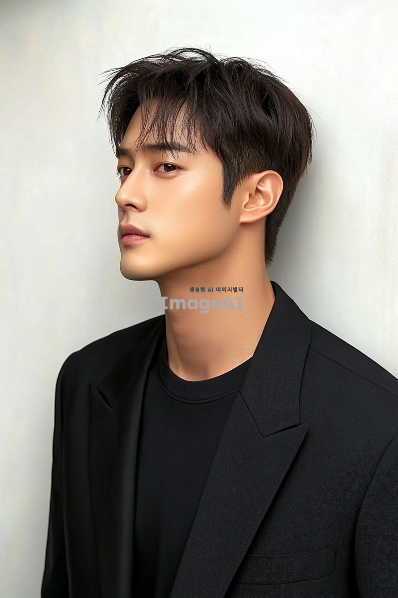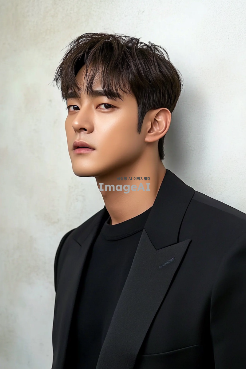 잘생긴 배우 HCl의 사진, 검은 정장과 티셔츠를 입고, 짧은 머리와 앞머리를 가지며, 측면에서 촬영된 모습, 한국 스타의 스타일로, 키가 큰 모습으로, 흰색 벽을 배경으로 서 있는 모습, 자연광과 부드러운 톤으로, 자연스러운 움직임을 담고 있다.