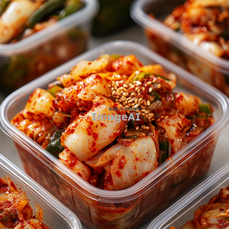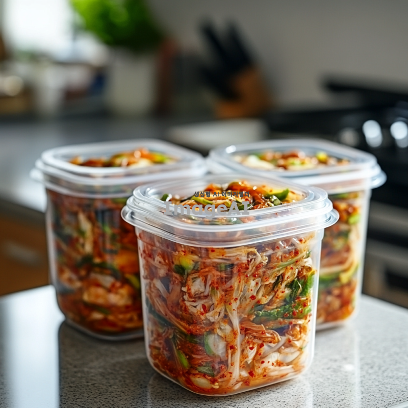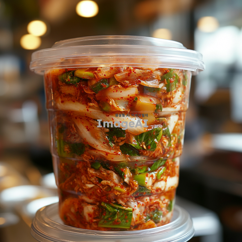 일회용 용기에 담긴 김치, 신선한 재료와 매콤한 양념이 어우러진 모습, 한국의 전통적인 김치 스타일, 배경은 깔끔한 주방, 자연광이 비치는 분위기, 고급스러운 느낌의 음식 사진.