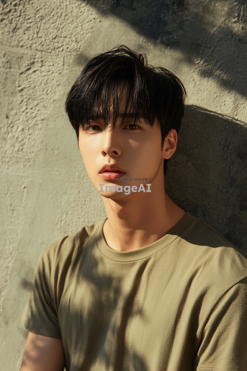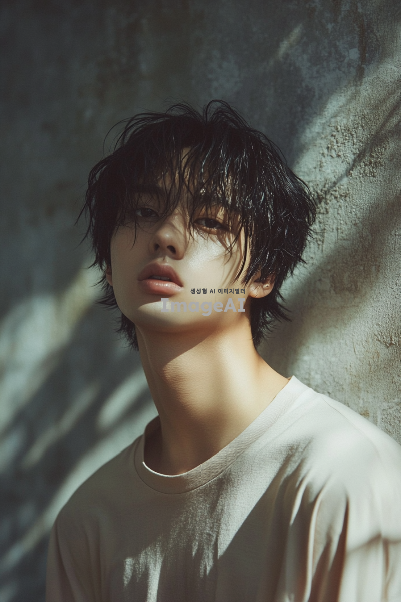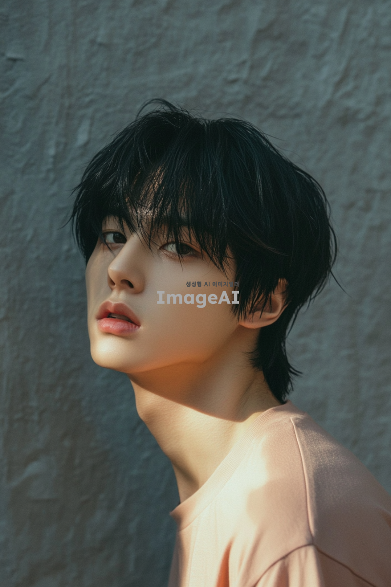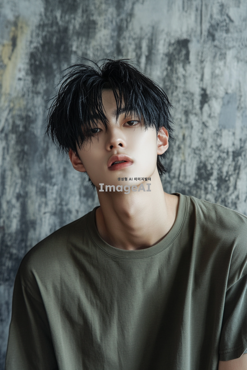 아시아 남성 모델의 사진으로, 검은 머리를 가지고 있다. 왼쪽은 곧고 약간 헝클어져 있다. 그는 앞머리가 있고 반신 사진이다. 배경 벽은 회색 질감 효과가 있다. 그는 단색의 반팔 티셔츠를 입고 있다. 빛은 위에서 비추어 그의 얼굴 윤곽을 강조하고 부드러운 그림자를 만든다.