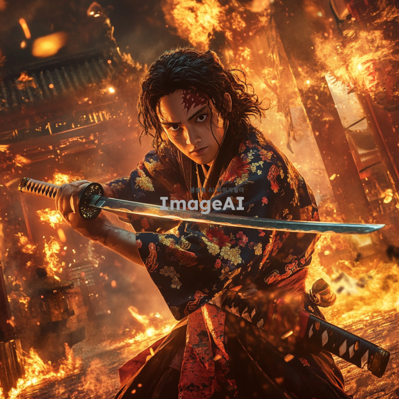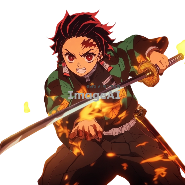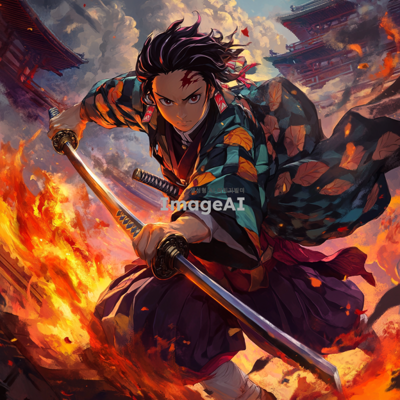 귀멸의 칼날의 탄지로를 중심으로 한 장면, 전통적인 일본의 배경 속에서 검을 들고 있는 모습, 강한 결의가 담긴 표정, 화려한 색감의 기모노를 입고 있으며, 주변에는 불꽃과 연기가 감도는 모습, 신비로운 분위기와 함께 전투 준비 자세를 취하고 있는 모습.