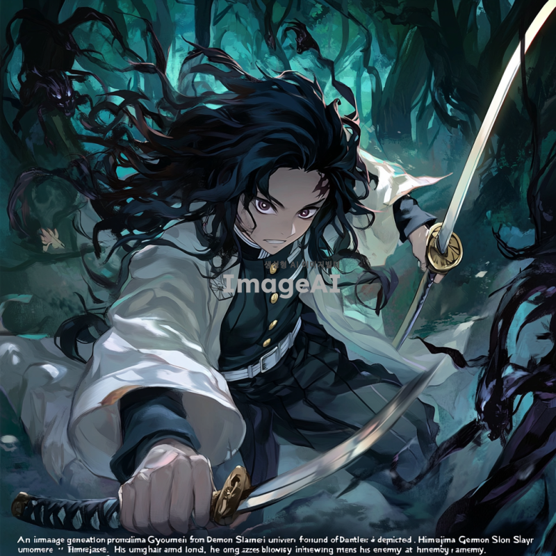 "귀멸의 칼날 세계관 속에서, 히메즈마 교메이가 전투 중인 모습. 그의 독특한 복장과 긴 머리카락이 바람에 휘날리고 있으며, 강렬한 표정으로 적을 응시하고 있다. 배경은 어두운 숲 속, 신비로운 분위기가 감도는 가운데, 그의 손에는 특별한 무기가 들려 있다. 주변에는 흐릿한 악마의 형체가 보이며, 긴장감 넘치는 순간을 포착한 장면."