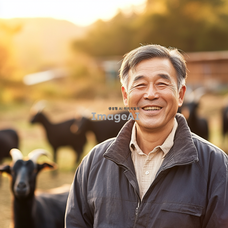 흑염소 농장에서 60대에서 70대 정도의 한국인 남성이 인자하게 웃고 있는 모습, 배경에는 건강한 흑염소들이 자연스럽게 풀을 뜯고 있는 풍경, 따뜻한 햇살이 비치는 평화로운 분위기, 신뢰감과 편안함을 주는 이미지.
