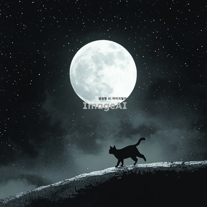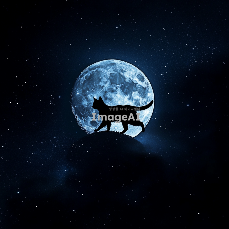 밤하늘에 밝은 보름달이 떠 있는 풍경 속에서, 고양이가 달 위를 우아하게 걷고 있는 모습. 고양이는 검은 실루엣만 보이는 모습, 달빛에 반사되어 신비로운 분위기를 자아내고 있다. 배경은 별이 가득한 어두운 하늘로, 고양이의 실루엣이 보름달의 빛에 살짝 드러나고 있다.