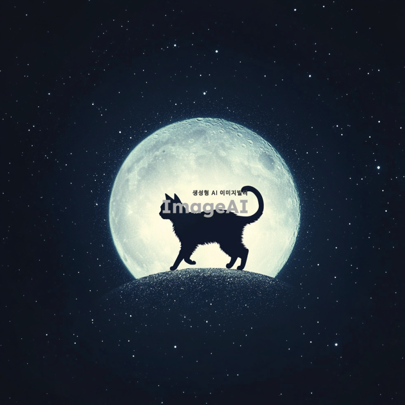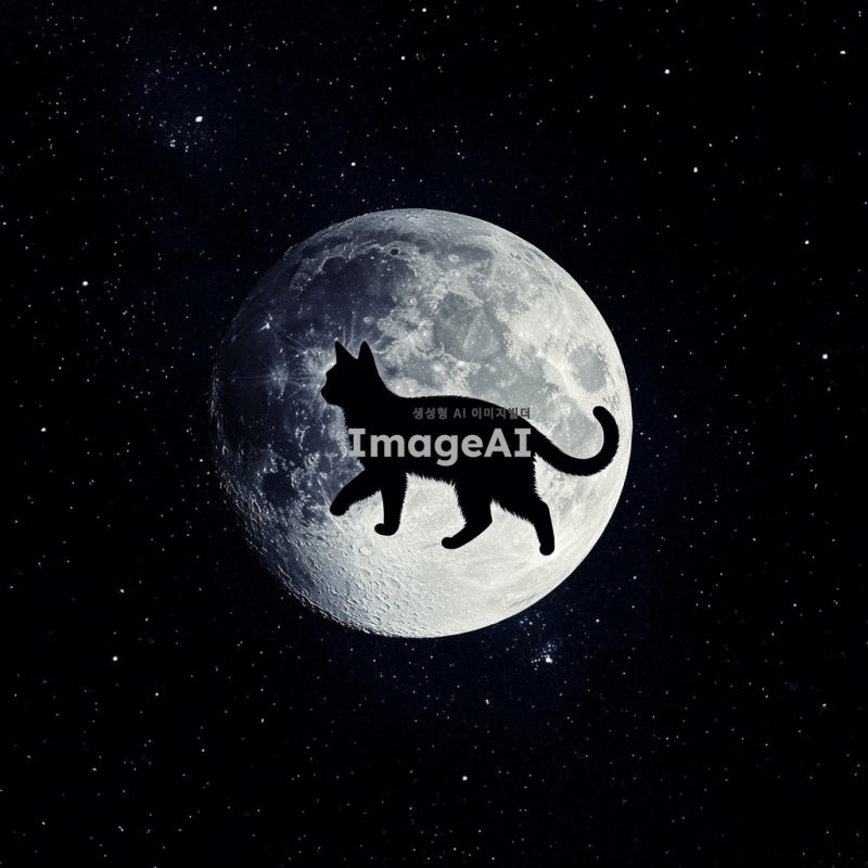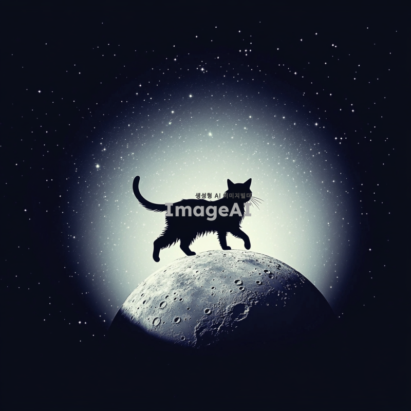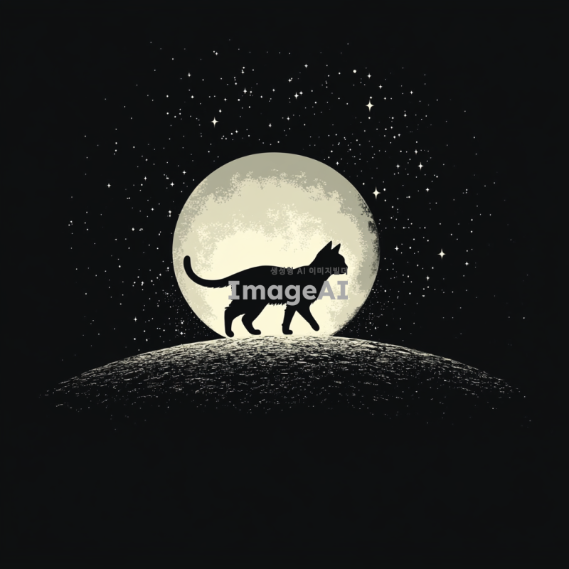밤하늘에 떠 있는 밝은 달의 표면 위를 걷고 있는 고양이의 실루엣. 주변은 어두운 우주 배경으로, 별들이 반짝이고 있다.