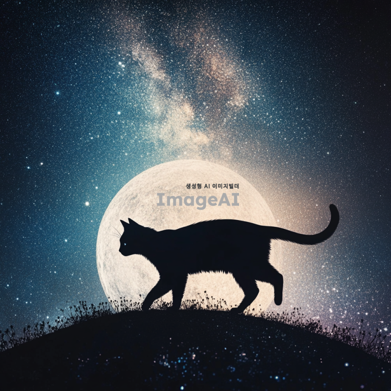 은하수를 배경으로, 밝은 보름달의 표면 바로 위를 걷고 있는 검은고양이. 은하수는 다양한 색상의 별들로 가득 차 있고, 전체적인 분위기는 몽환적이고 신비로운 느낌.