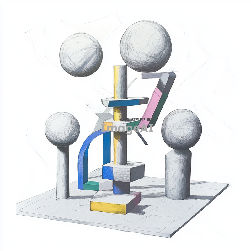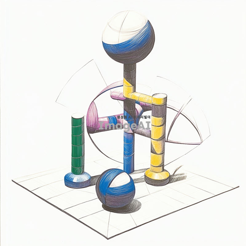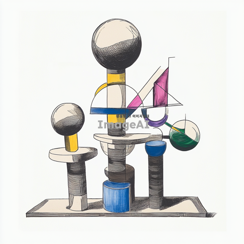 기하학적인 조각품을 주제로 한 스케치, 원기둥, 원뿔, 삼각뿔, 정육면체, 구, 반구 등의 기하학적 형태가 조화롭게 배열된 모습, 현대적인 디자인 요소와 함께 독창적인 형태를 강조, 부드러운 선과 대칭적인 구성, 배경은 단순하고 깔끔하게 처리된 느낌의 아트워크.