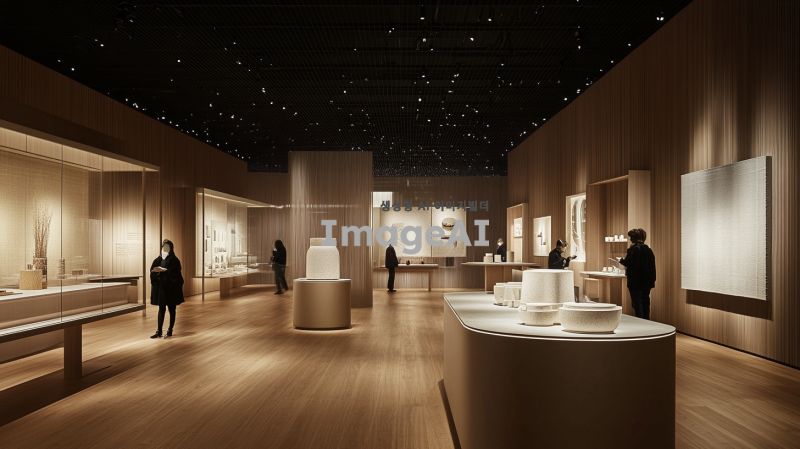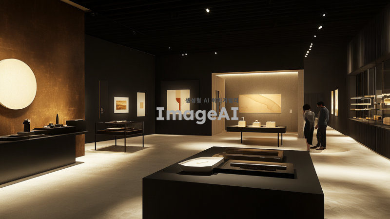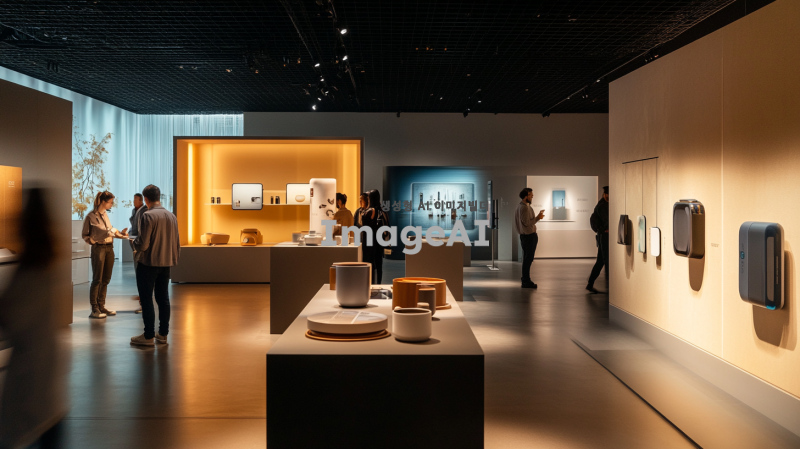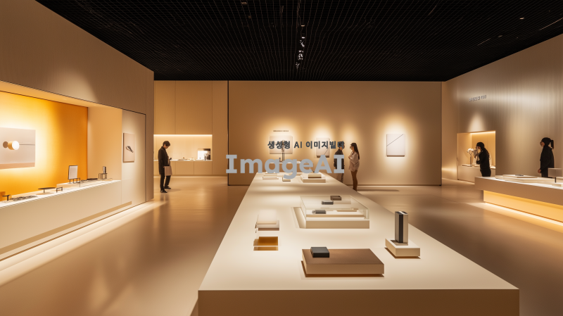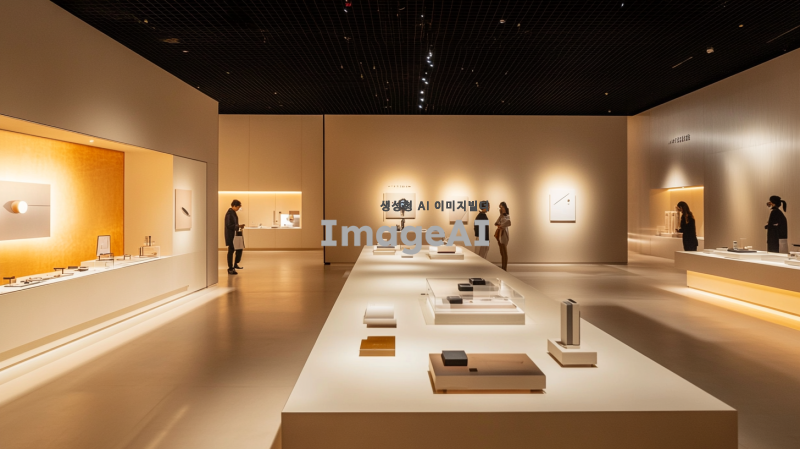 리퍼 전시 상품을 위한 이미지: 현대적인 디자인의 전시 공간, 다양한 리퍼 제품들이 세련되게 배치되어 있는 모습, 조명은 부드럽고 따뜻한 느낌으로, 관람객들이 제품을 살펴보는 장면, 배경에는 미니멀한 아트워크가 있는 갤러리 스타일의 공간, 전체적으로 고급스럽고 세련된 분위기.