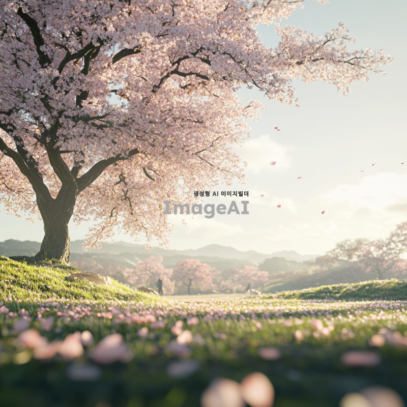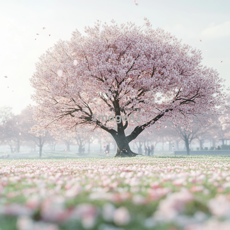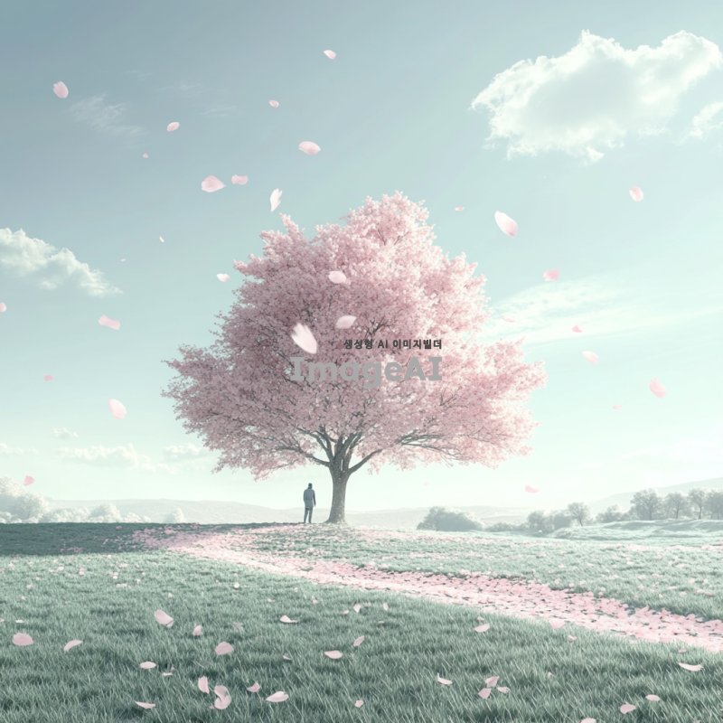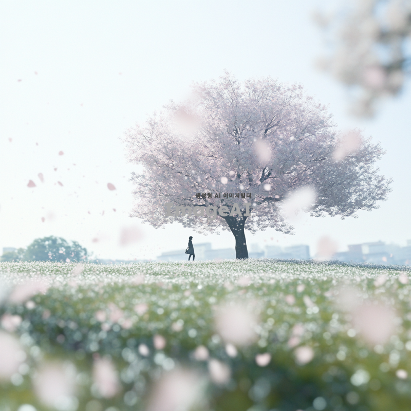 초봄의 설렘과 선선한 바람이 느껴지는 분위기, 맑은 하늘색과 멀리 있는 나무들, 평평한 바닥. 사실적인 사진 느낌으로, 중앙에 벚꽃나무가 서 있고 그 주위로 벚꽃이 흩날리는 배경. 바닥에는 연두빛의 잔디와 벚꽃잎이 가득하며, 한 사람이 나무 아래에 서 있는 모습, 멀리서 카메라가 바라보고 있는 장면.