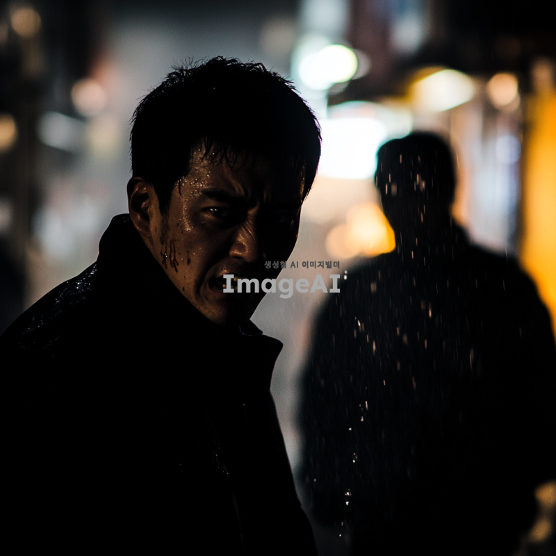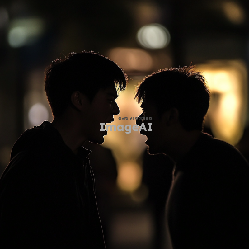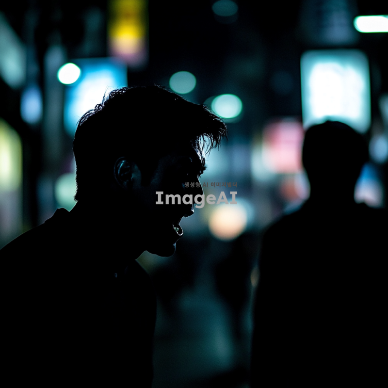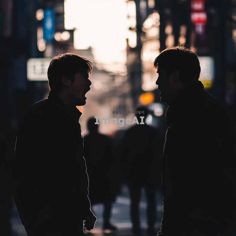 화난 표정을 짓고 있는 한국인 남성의 실루엣, 도시의 거리에서 다른 사람과 갈등을 겪고 있는 모습, 어두운 배경에 대비되는 실루엣, 긴장감이 느껴지는 분위기, 주변에 흐릿하게 보이는 사람들, 감정이 고조된 순간을 포착한 이미지