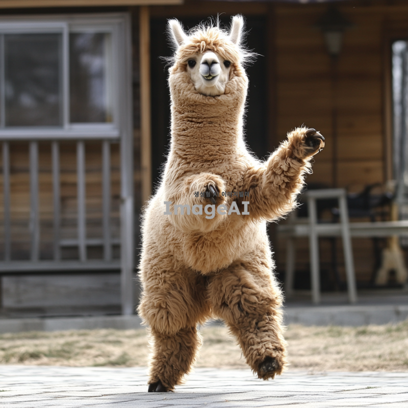 사람처럼 춤추는 알파카. 역동적인 동작으로 신나게 춤춘다. 친구들도 함께 춤춘다.