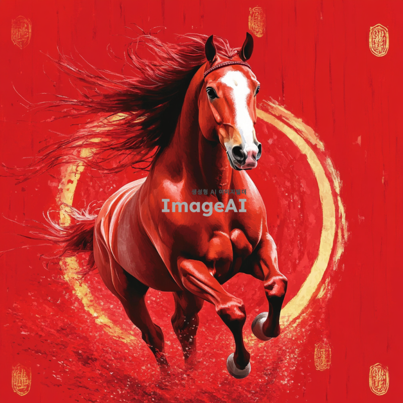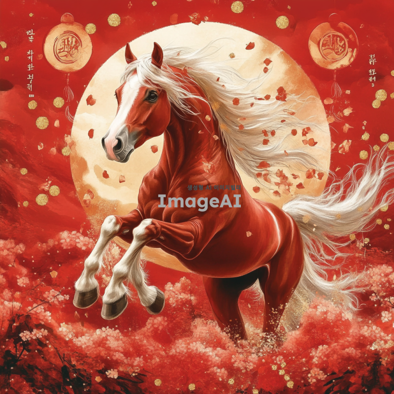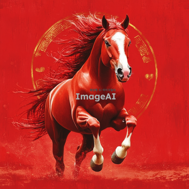 붉은 배경에서 힘차게 달리는 붉은 말, 생동감 넘치는 표정과 우아한 자세, 빛나는 갈기와 꼬리, 강렬한 색감이 강조된 장면, 한국의 전통적인 요소가 어우러진 분위기.